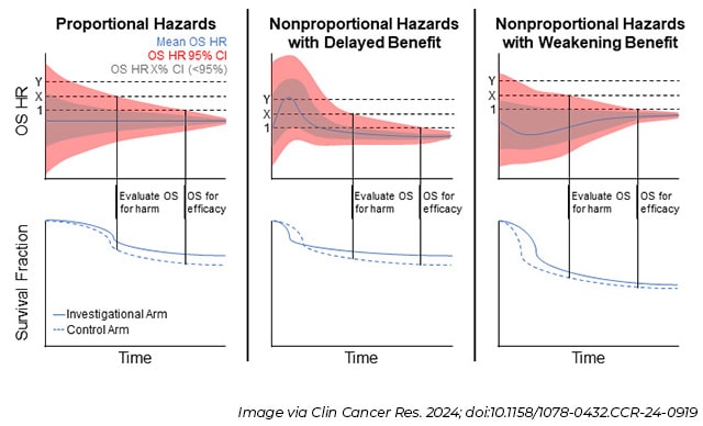 This workshop inspired the recent Clinical Cancer Research article that summarizes key considerations for trial designs and drug development strategy, including when to consider OS as the primary endpoint. Importantly, the article encourages trial sponsors to prospectively plan to collect and analyze OS data for every late-phase trial, regardless of whether it is a formal trial endpoint. Additionally, the article details new statistical methodologies to support using OS data to evaluate new therapies for potential harm to patients (see figure), when the data are too limited to be used for efficacy evaluations.