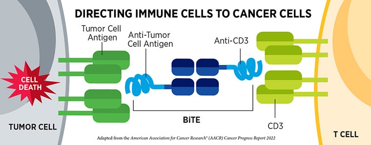 Tarlatamab-dlle is a type of immunotherapy known as a bispecific T-cell engager (BiTE) that simultaneously binds proteins on both cancer cells and T cells (a type of immune cell). By doing so, it brings the two cell types together and allows the T cells to mount an immune response against the cancer cells. Tarlatamab-dlle recognizes the delta-like ligand 3 (DLL3) protein on cancer cells and the CD3 protein on T cells.