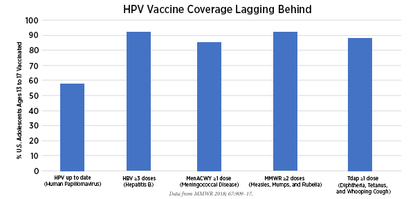 This low HPV vaccine coverage contrasts starkly with coverage for other childhood vaccines. For example, 92 percent of adolescents ages 13 to 17 have received two or more doses of the MMR vaccine that protects against measles, mumps, and rubella.