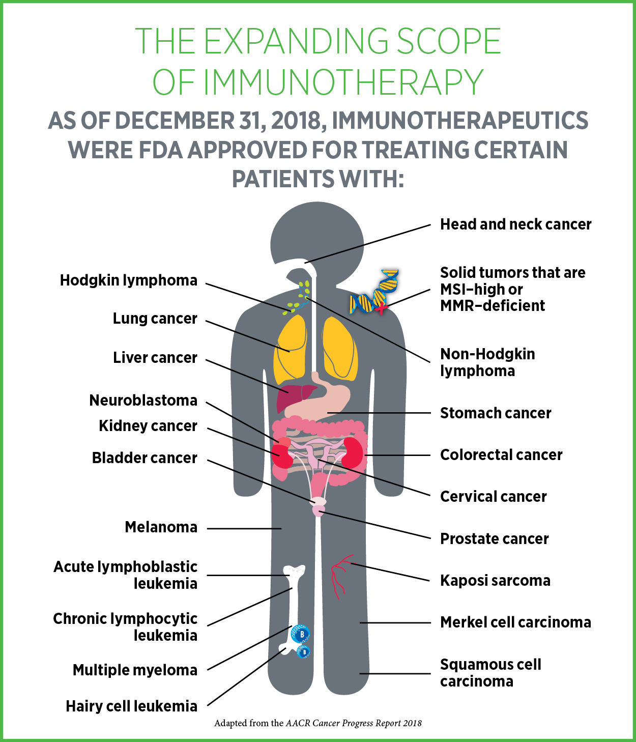 In the past decade, the use of immunotherapeutics in cancer has revolutionized the treatment of several cancer types. As of January 31, 2019, there were 20 immunotherapeutics approved by the FDA to treat 20 types of cancer and to treat solid tumors with a certain molecular signature.