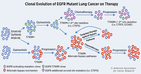 Even though patients with EGFR-mutated NSCLC experience substantial benefit from EGFR TKIs, their disease tends to progress within a year because the tumors ultimately develop resistance to the therapeutics. The most frequent activating EGFR mutations in NSCLC include the exon 19 deletion and L858R. Patients whose tumors harbor these activating EGFR mutations are treated with first-generation EGFR TKIs. While most patients initially respond to these therapeutics, more than 60 percent of them develop resistance by acquiring the “gatekeeper” point mutation, T790M. Third-generation inhibitors, such as osimertinib, were developed to target the T790M clone and to be active against the original exon 19 deletion and L858R. Patients, however, develop resistance to this treatment as well, through alternate bypass mechanisms, as described in this chart below.