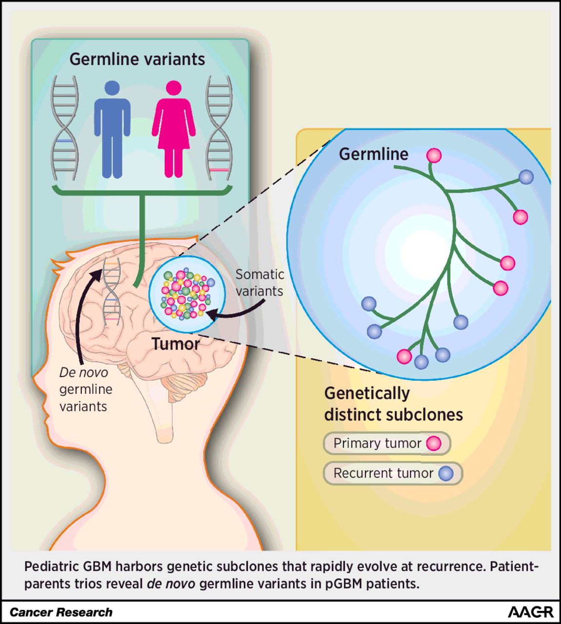 Pediatric glioblastoma, while rare, is a lethal brain tumor with no effective standard of care treatment. To elucidate mechanisms of tumor evolution, the authors utilized whole-genome sequencing to compare primary tumors with corresponding recurrent tumors and found that less than 8 percent of nonsynonymous single-nucleotide variants were shared between the matched pairs. The authors also compared the genomes of two pediatric patients with the genomes of their parents and found that genetic variants could be somatic, inherited from a healthy parent, or could arise de novo in the germlines of the pediatric patients. Additional analyses supported a model of slow-cycling cancer stem cells which drive the formation of rapidly proliferating progenitor-like cells. These results suggest that effective therapies for pediatric glioblastoma must account for its proliferative hierarchy and genomic heterogeneity.