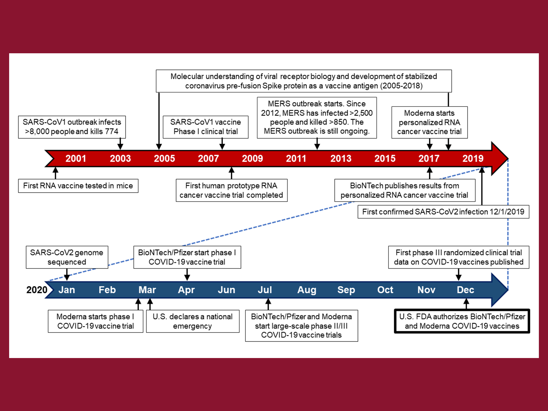 With this research as a platform, BioNTech-Pfizer and Moderna were able to generate the first COVID-19 vaccines and start phase I clinical trials roughly two months after the genome sequence of SARS-CoV-2 was published. For comparison, it took more than nine months to start a phase I clinical trial for an Ebola vaccine during the 2014 outbreak.