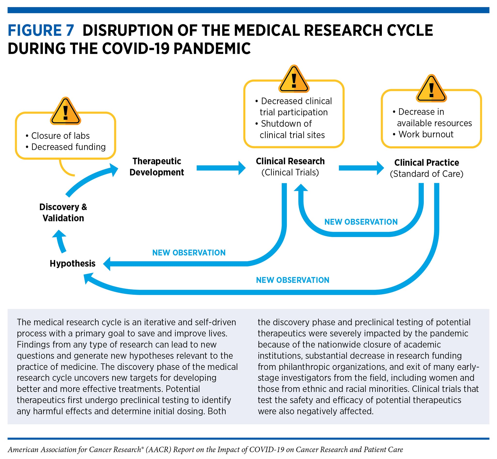 The COVID-19-related disruptions to the cancer research continuum have also affected the careers of researchers, especially early-stage, minority, and female investigators (See sidebar: Disruption of the Medical Research Cycle During the COVID-19 Pandemic).