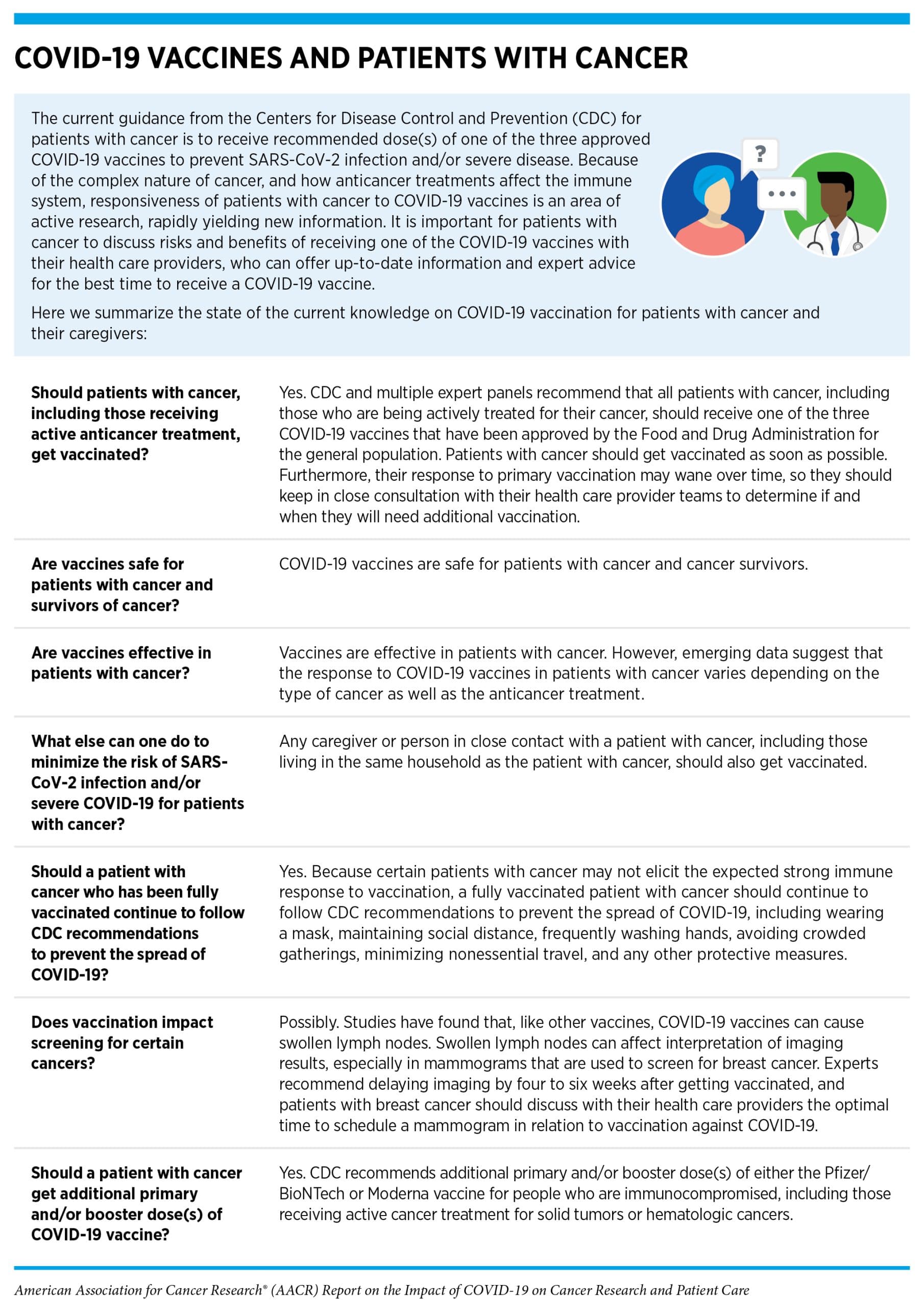 There is overwhelming evidence that cancer is an independent risk factor for adverse outcomes in patients who develop COVID-19 and that the risk of infection is seven times higher in recently diagnosed cancer patients (See sidebar: COVID-19 in Patients With Cancer). For many patients with cancer, vaccination is one of the safest and most effective ways to reduce COVID-19 infection and severe disease (See sidebar: COVID-19 Vaccines and Patients with Cancer).