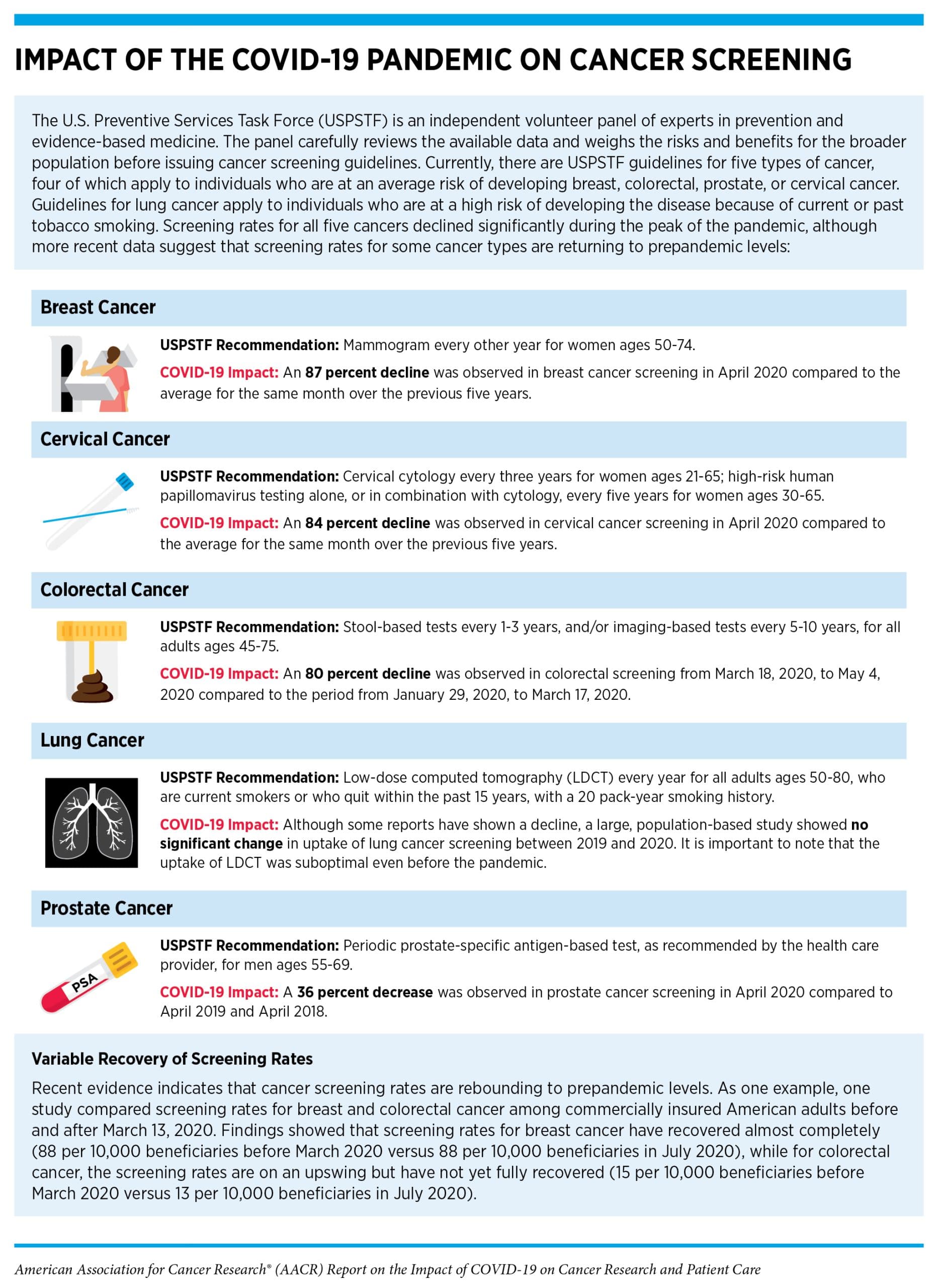 Early in 2020, the Centers for Medicare and Medicaid Services recommended that health care institutions prioritize COVID-19 care and cease all non-urgent, preventative services including cancer screening examinations (See sidebar: Impact of the COVID-19 Pandemic on Cancer Screening). This led to a precipitous drop in the U.S. screening rates for breast, colon, cervical, and prostate cancer.