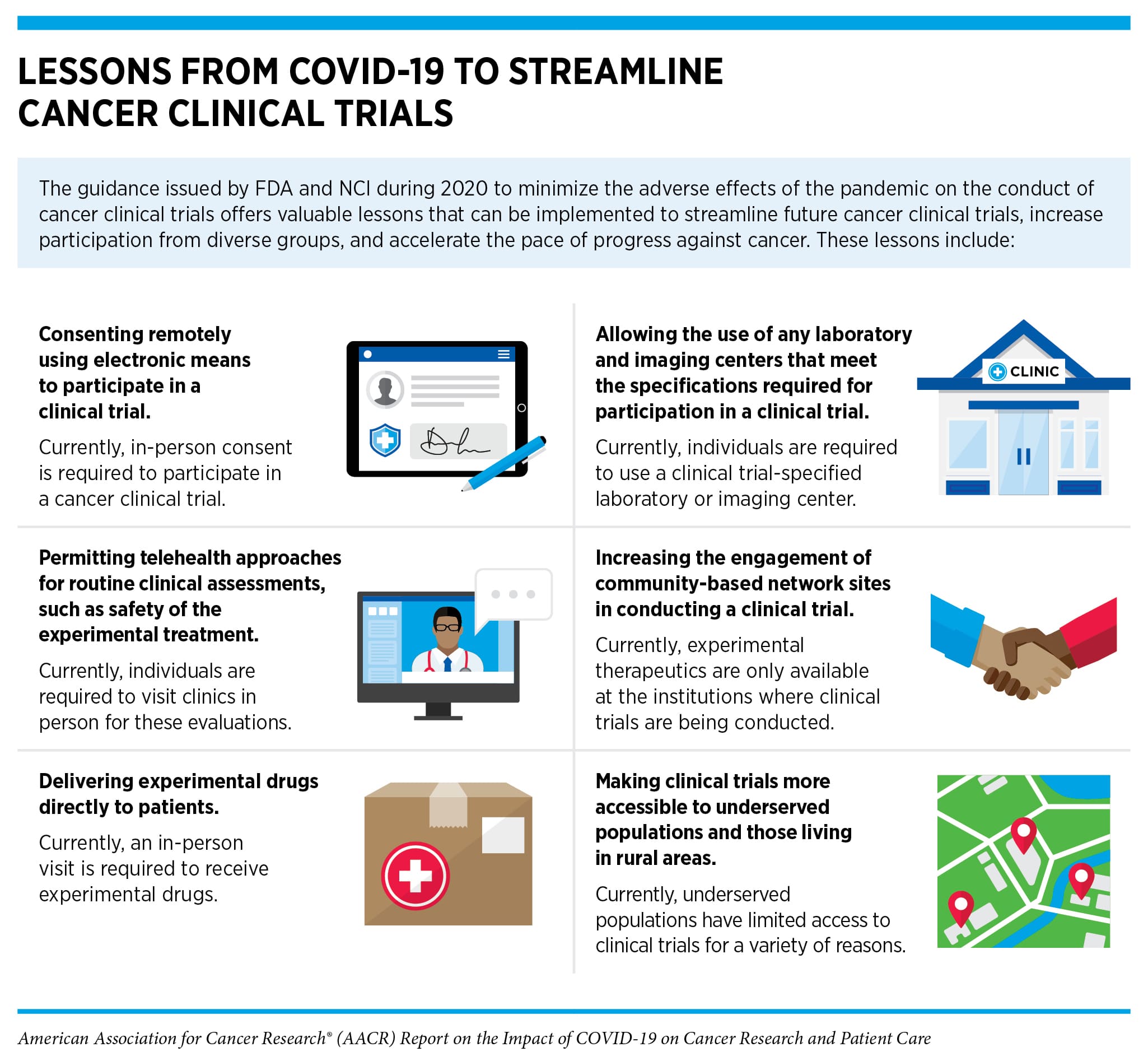 While discussing these adaptations to clinical research, Ribas said, “We went from doing [treatments] in person to doing video visits and were able to ship drugs to him, which was not allowed before the pandemic. That’s one of the things that I hope will be carried on after the pandemic when we go back to normal business.” The report also highlights other changes to the conduct of clinical trials, including the use of telehealth in place of in-person visits and decentralized testing at local hospitals to minimize travel time for patients with cancer (See sidebar: Lessons From COVID-19 to Streamline Cancer Clinical Trials).