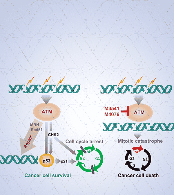 Many cancer treatments, including radiation and certain forms of chemotherapy, induce double-strand breaks in the DNA of cancer cells. These breaks, however, are typically repaired by cellular machinery, including the kinase ataxia telangiectasia-mutated (ATM), which has become an attractive target to enhance the efficacy of DNA-damaging therapies. In this study, the researchers described a new class of optimized ATM inhibitors, including the compounds M3541 and M4076. They demonstrated that, in several cancer cell lines, both compounds specifically inhibited ATM and blocked increases in ATM activity caused by radiation or the chemotherapy bleomycin. Treatment with either compound in combination with radiotherapy also increased the number of double-strand breaks, decreased cell growth due to cell cycle arrest, and reduced the formation of clonal colonies, as compared with either treatment alone. In mouse models harboring cell xenografts, both compounds drove robust tumor regression when combined with radiation, the chemotherapy cisplatin, or both. M4076 was selected for further development due to its improved solubility and potency, and it was shown to enhance the activity of other DNA damaging agents, including topoisomerase inhibitors and PARP inhibitors. The researchers suggest that combining M4076 with other DNA-damaging therapies may improve patient prognosis in a variety of tumor types, and they are currently testing M4076 in a phase I clinical trial. This article was highlighted and featured on the cover of the June issue.