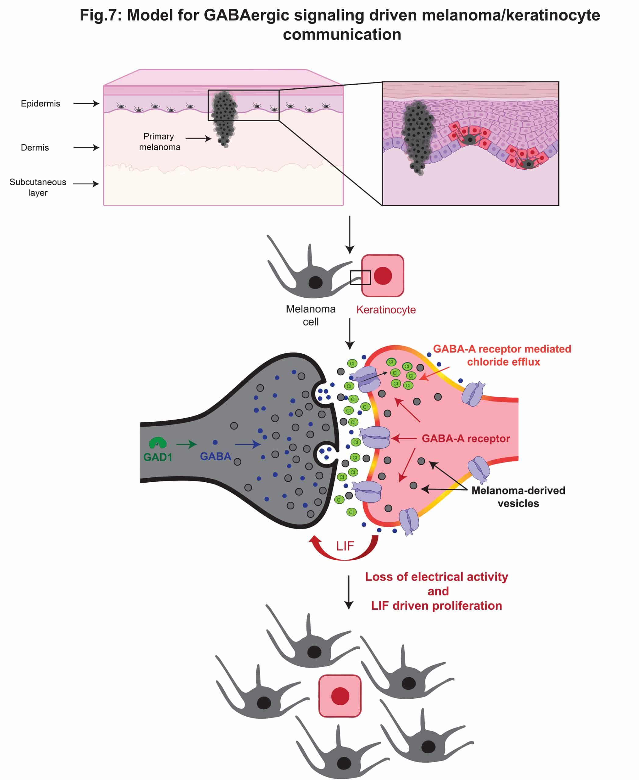 In neuronal communication, GABA inhibits a neuron’s ability to send or receive electrical signals. The researchers observed a similar effect in skin cells, as GABA inhibited electrical activity in keratinocytes and induced keratinocytes to secrete LIF1, a protein known to promote melanoma.