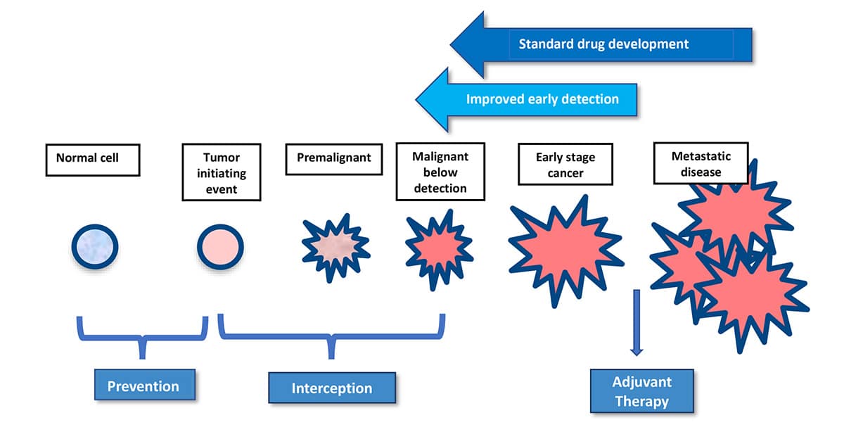 Why is the window of interception so critical? Domchek and Vonderheide used the example of removing polyps during a colonoscopy—the lesions are easy to treat because they have yet to spread and are less genomically complex. Treating lesions early may circumvent many problems that arise when cancer progresses. For example, cancer vaccines and immunotherapy may have a stronger impact on early-stage tumors than late-stage tumors because the cancers will have not yet honed their immune suppressive skills.