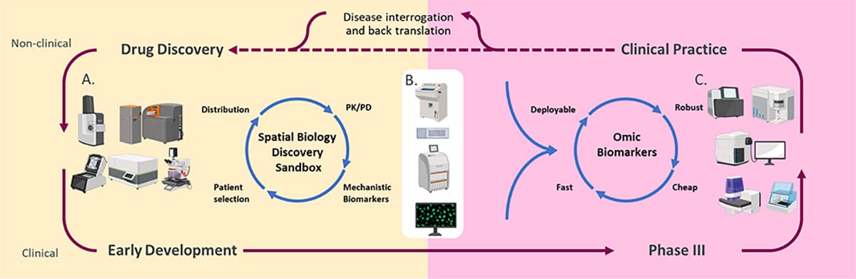 Richard Goodwin, PhD, head of Integrated Imaging Sciences and senior director of Clinical Pharmacology and Safety Sciences at AstraZeneca, and colleagues discussed the potential of spatial technologies that aggregate genomic, transcriptomic, and proteomic data—so-called “multiomics” analyses. By using machine learning to integrate these massive data sets from individual cells in a fixed architecture, researchers can significantly boost their understanding of tumor heterogeneity and possible cancer biomarkers, Goodwin and colleagues wrote.
