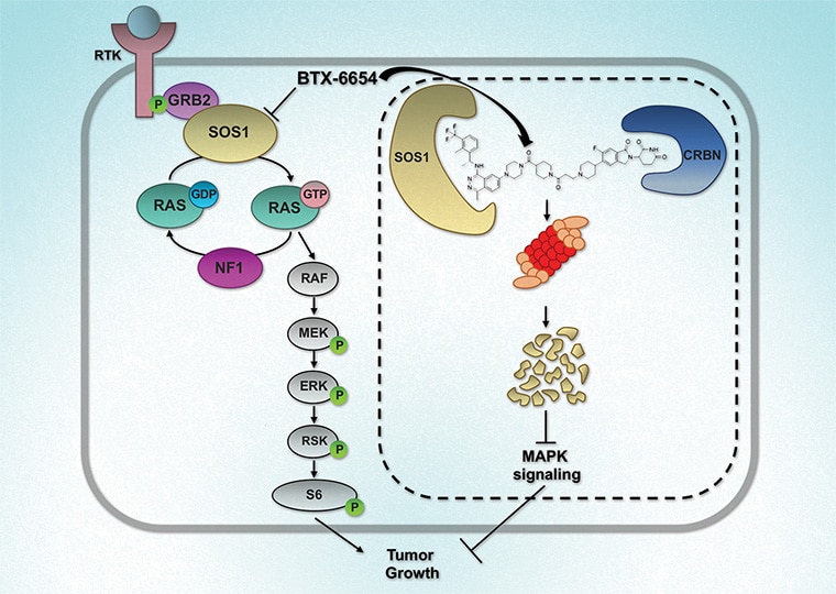 Mutations within the oncogene KRAS drive an estimated 25% of all cancers. Only allele-specific KRAS G12C inhibitors are currently available and are associated with the emergence of acquired resistance, partly due to upstream pathway reactivation. Given its upstream role in the activation of KRAS, son of sevenless homolog 1 (SOS1), has emerged as an attractive therapeutic target. Agents that target SOS1 for degradation could represent a potential pan-KRAS modality that may be capable of circumventing certain acquired resistance mechanisms. Here, we report the development of two SOS1 cereblon-based bifunctional degraders, BTX-6654 and BTX-7312, cereblon-based bifunctional SOS1 degraders. Both compounds exhibited potent target-dependent and -specific SOS1 degradation. BTX-6654 and BTX-7312 reduced downstream signaling markers, pERK and pS6, and displayed antiproliferative activity in cells harboring various KRAS mutations. In two KRAS G12C xenograft models, BTX-6654 degraded SOS1 in a dose-dependent manner correlating with tumor growth inhibition, additionally exhibiting synergy with KRAS and MEK inhibitors. Altogether, BTX-6654 provided preclinical proof of concept for single-agent and combination use of bifunctional SOS1 degraders in KRAS-driven cancers.