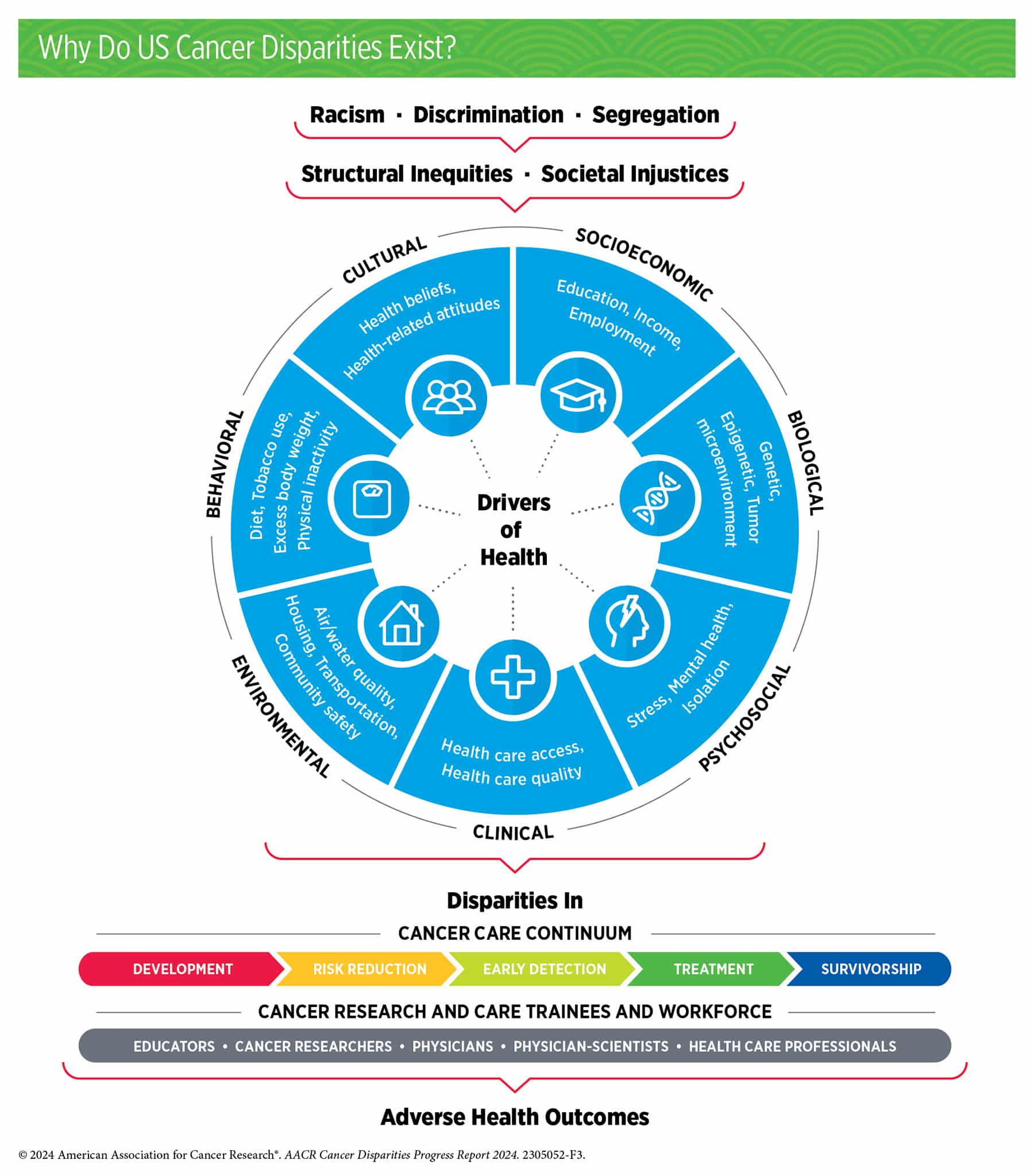 To raise awareness of disparities like these and bring attention to the importance of cancer disparities research in reducing health inequities, the American Association for Cancer Research (AACR) launched its Cancer Disparities Progress Report in 2020. Published every two years, the third edition—which was released May 15, 2024—shares nine patient stories like this one from Gilbert while also diving into the latest statistics to highlight how factors such as race, ethnicity, age, sexual orientation, gender identity, socioeconomic status, and geographic location can factor into the development of cancer and the care of patients.