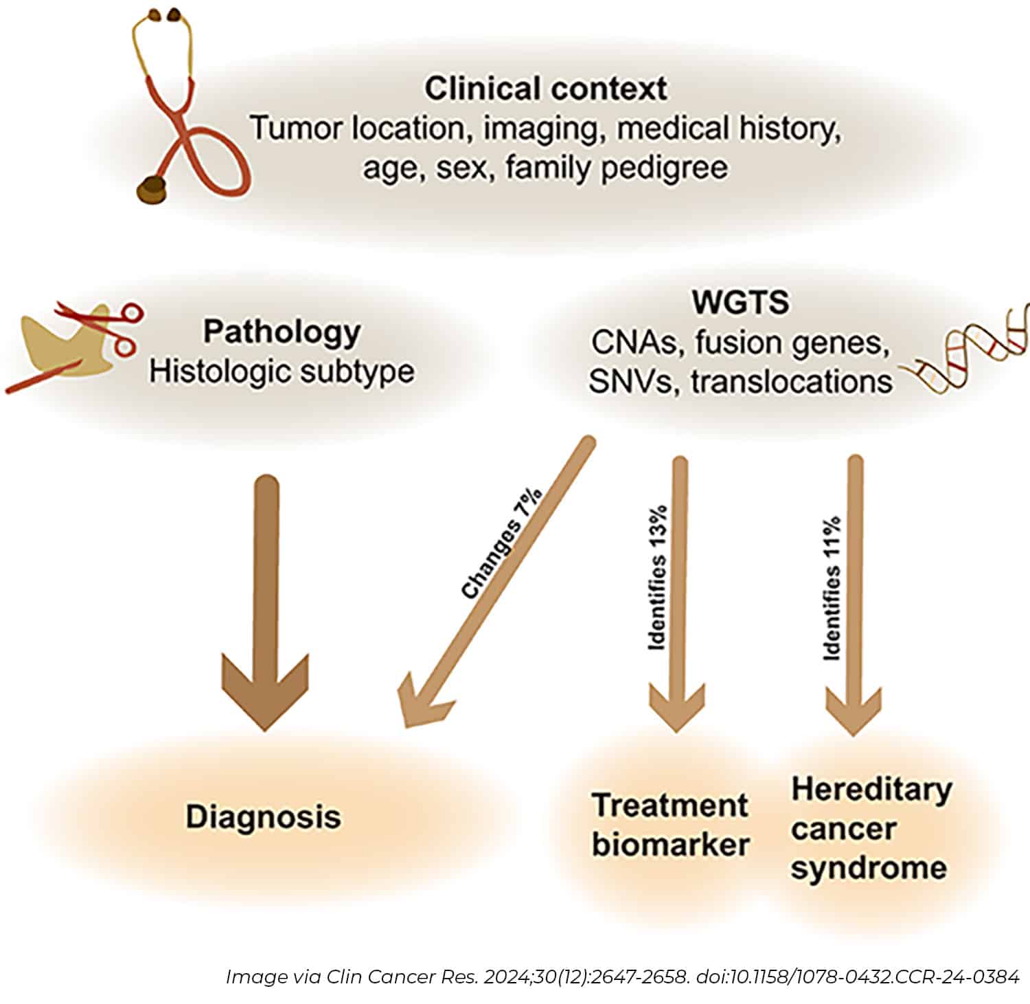 Currently, sarcoma tumors are classified mostly through techniques used to study morphology—in which a sample of the tumor is examined for different characteristics including its size, shape, and color—and immunohistochemistry (IHC) staining—in which antibodies are used to detect protein markers. Given the challenges associated with properly classifying sarcomas, researchers tested whether the use of whole-genome and whole-transcriptome sequencing (WGTS) could be a more effective option. This process captures information about both the DNA and RNA in cancer cells, including mutations, genetic signatures, and potential actionable targets.