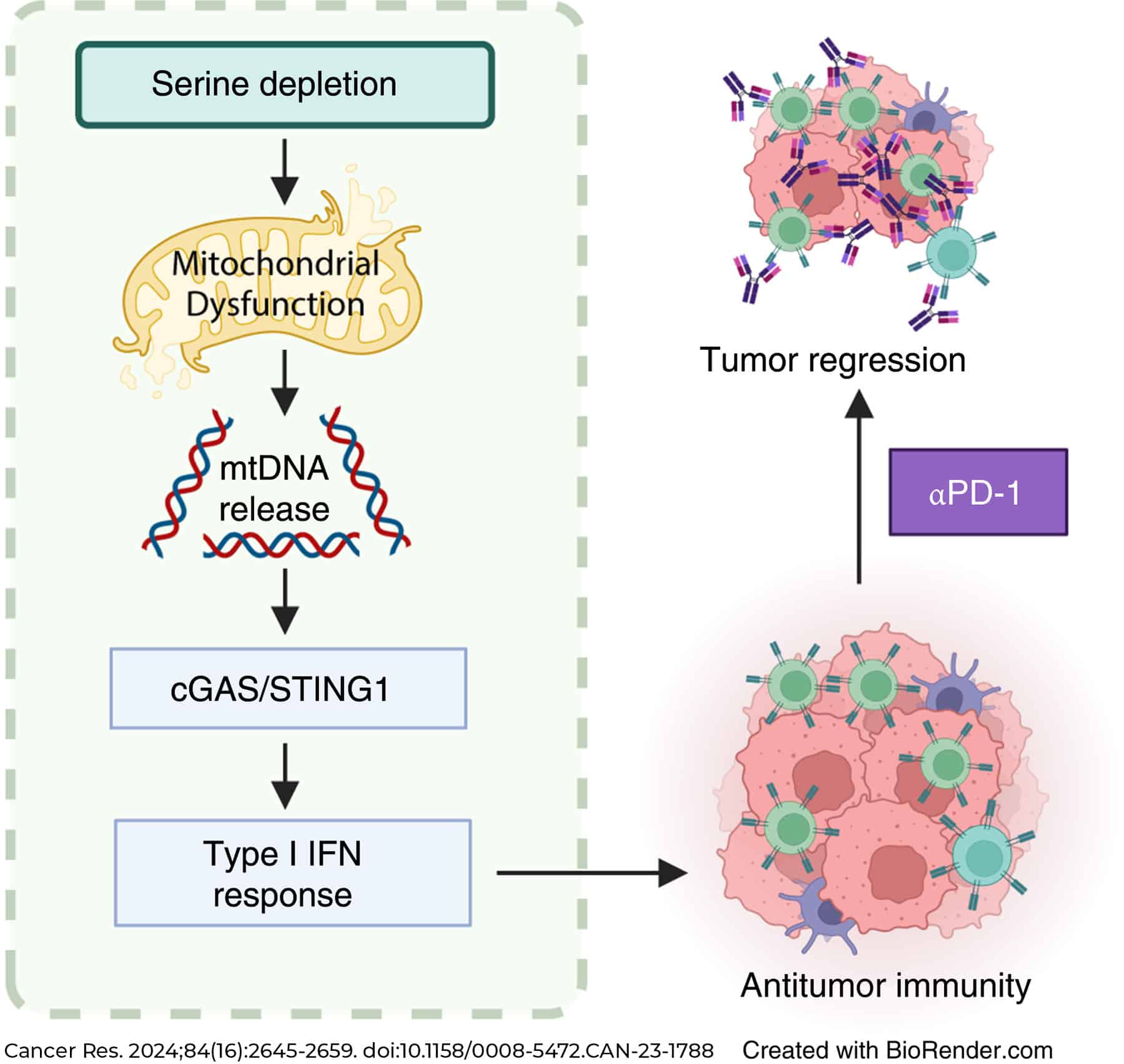 Significance: Depriving cancer cells of serine provokes mitochondrial perturbations that induce cytosolic mitochondrial DNA accumulation and subsequent activation of cGAS-STING signaling, stimulating tumor-targeting immune responses that can be enhanced with PD-1 targeted therapy.