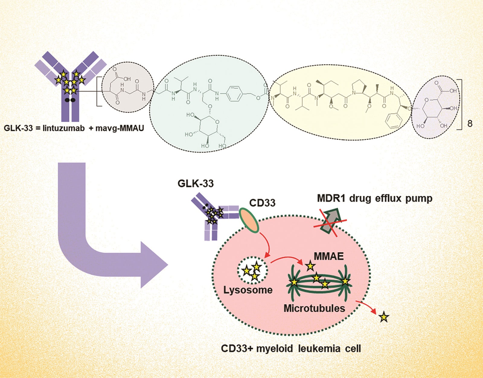 CD33 (Siglec-3) is a cell surface receptor expressed in approximately 90% of acute myeloid leukemia (AML) blasts, making it an attractive target for therapy of AML. Although previous CD33-targeting antibody–drug conjugates (ADC) like gemtuzumab ozogamicin (GO, Mylotarg) have shown efficacy in AML treatment, they have suffered from toxicity and narrow therapeutic window. This study aimed to develop a novel ADC with improved tolerability and a wider therapeutic window. GLK-33 consists of the anti-CD33 antibody lintuzumab and eight mavg-MMAU auristatin linker payloads per antibody. The experimental methods included testing in cell cultures, patient-derived samples, mouse xenograft models, and rat toxicology studies. GLK-33 exhibited remarkable efficacy in reducing cell viability within CD33-positive leukemia cell lines and primary AML samples. Notably, GLK-33 demonstrated antitumor activity at single dose as low as 300 mg/kg in mice, while maintaining tolerability at single dose of 20 to 30 mg/kg in rats. In contrast with both GO and lintuzumab vedotin, GLK-33 exhibited a wide therapeutic window and activity against multidrug-resistant cells. The development of GLK-33 addresses the limitations of previous ADCs, offering a wider therapeutic window, improved tolerability, and activity against drug-resistant leukemia cells. These findings encourage further exploration of GLK-33 in AML through clinical trials.