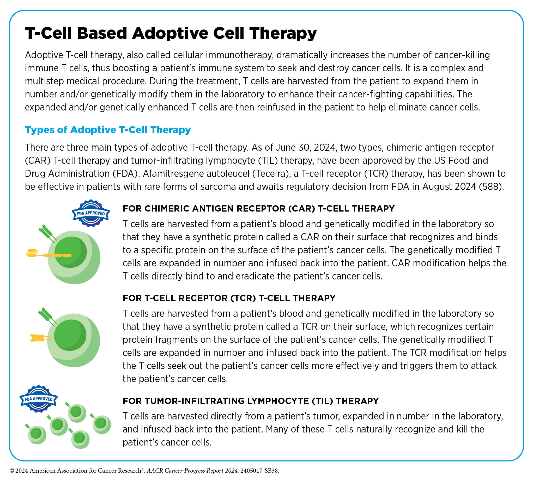 - Afamitresgene autoleucel (Tecelra; afami-cel) is the first TCR T-cell therapy approved for use in cancer. It received accelerated approval this quarter for the treatment of certain adult patients with unresectable or metastatic synovial cell sarcoma, a type of soft tissue sarcoma, who have received prior chemotherapy.