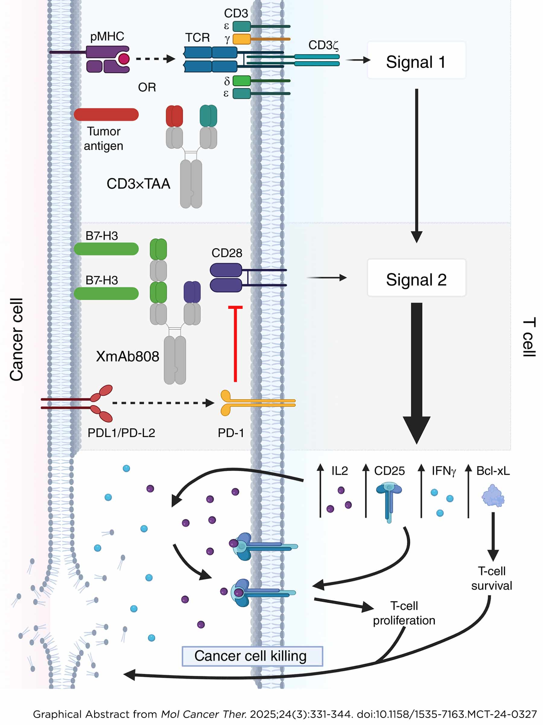 T-cell activation is a multistep process requiring T-cell receptor engagement by peptide–MHC complexes (Signal 1) coupled with CD28-mediated costimulation (Signal 2). Tumors typically lack expression of CD28 ligands, so tumor-specific Signal 1 (e.g., neoepitope presentation) without costimulation may be ineffective or even induce T-cell anergy. We designed the bispecific antibody XmAb808 to co-engage the tumor-associated antigen B7-H3 with CD28 to promote T-cell costimulation within the tumor microenvironment. XmAb808 costimulation was measured by its ability to activate and expand T cells and enhance T cell–mediated cancer cell killing in cocultures of human peripheral blood mononuclear cells and cancer cells and in mice engrafted with human peripheral blood mononuclear cells and tumor xenografts. XmAb808 avidly bound cancer cells and stimulated IL2 and IFNγ secretion from T cells cocultured with cancer cells engineered to deliver Signal 1 to T cells via a surface-expressed anti-CD3 antibody. XmAb808 enhanced expression of the antiapoptotic factor Bcl-xL and CD25, promoting survival and IL2-dependent expansion of T cells coupled with increased T cell–mediated cytotoxicity in vitro. XmAb808 combined with an EpCAM×CD3 bispecific antibody to enhance target cell killing through IL2-dependent expansion of CD25+ T cells. This combination also suppressed pancreatic tumor xenograft growth in mice. Furthermore, XmAb808 combined with an anti–programmed cell death protein 1 antibody to suppress breast tumor xenograft growth in mice. XmAb808 as monotherapy and in combination with an anti–programmed cell death protein 1 antibody is currently in clinical development in patients with advanced solid tumors. Our results suggest that XmAb808 may also combine with tumor antigen–targeted anti-CD3 (Signal 1) T-cell engagers.
