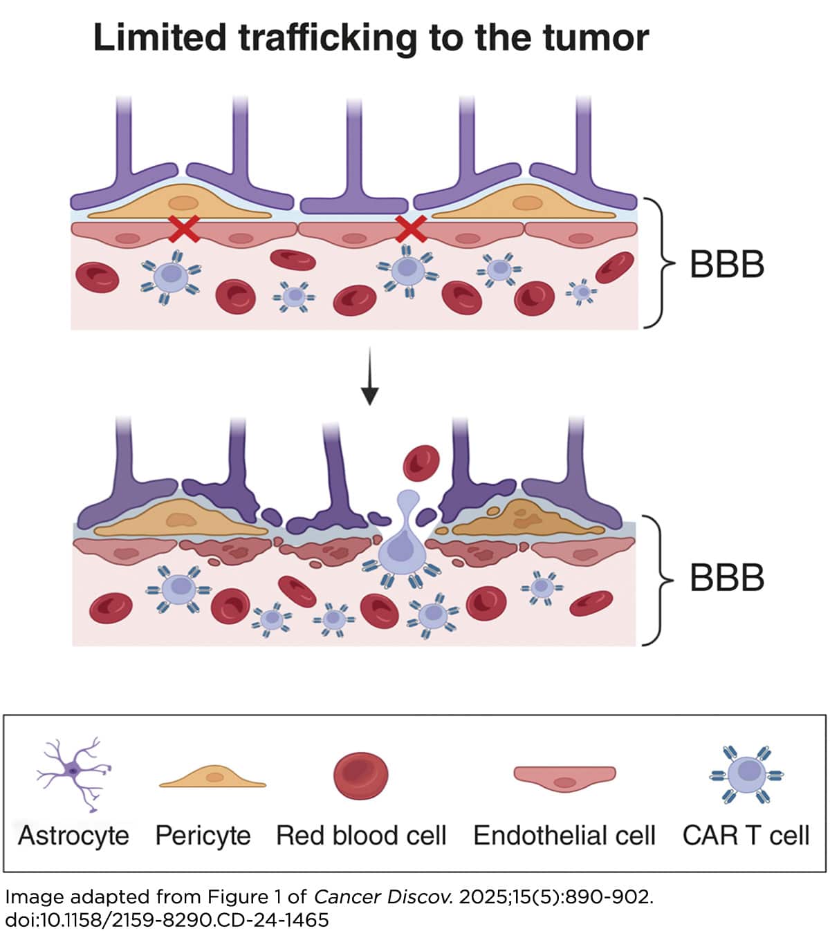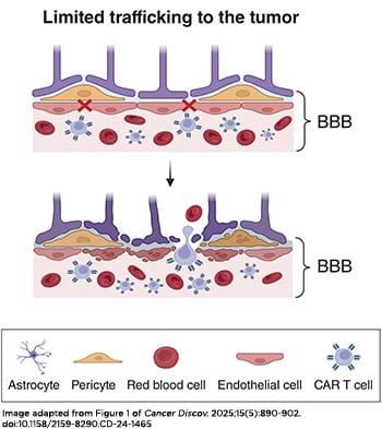 But the peripheral blood has drastically different features than the privileged vault of the brain, and brain cancers have little in common with blood cancers. In leukemia, CAR T cells released into the bloodstream can roam freely to find cancer. But the brain is an entirely different arena, and the blood-brain barrier can bar circulating CAR T cells from easy entry and may hinder their ability to engage brain tumors in children or adults.