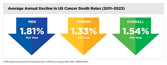 With the publication of the Cancer Progress Report’s 15th edition, the American Association for Cancer Research (AACR) celebrates not only the progress made against cancer that the report has marked throughout the years but also what that progress stands for. Impressive though the statistics may be (and they are quite impressive, including a remarkable 1.54% decline in the overall U.S. cancer death rate each year from 2011 to 2023), the human lives that the stats describe are ultimately what matter.