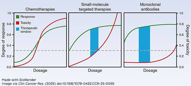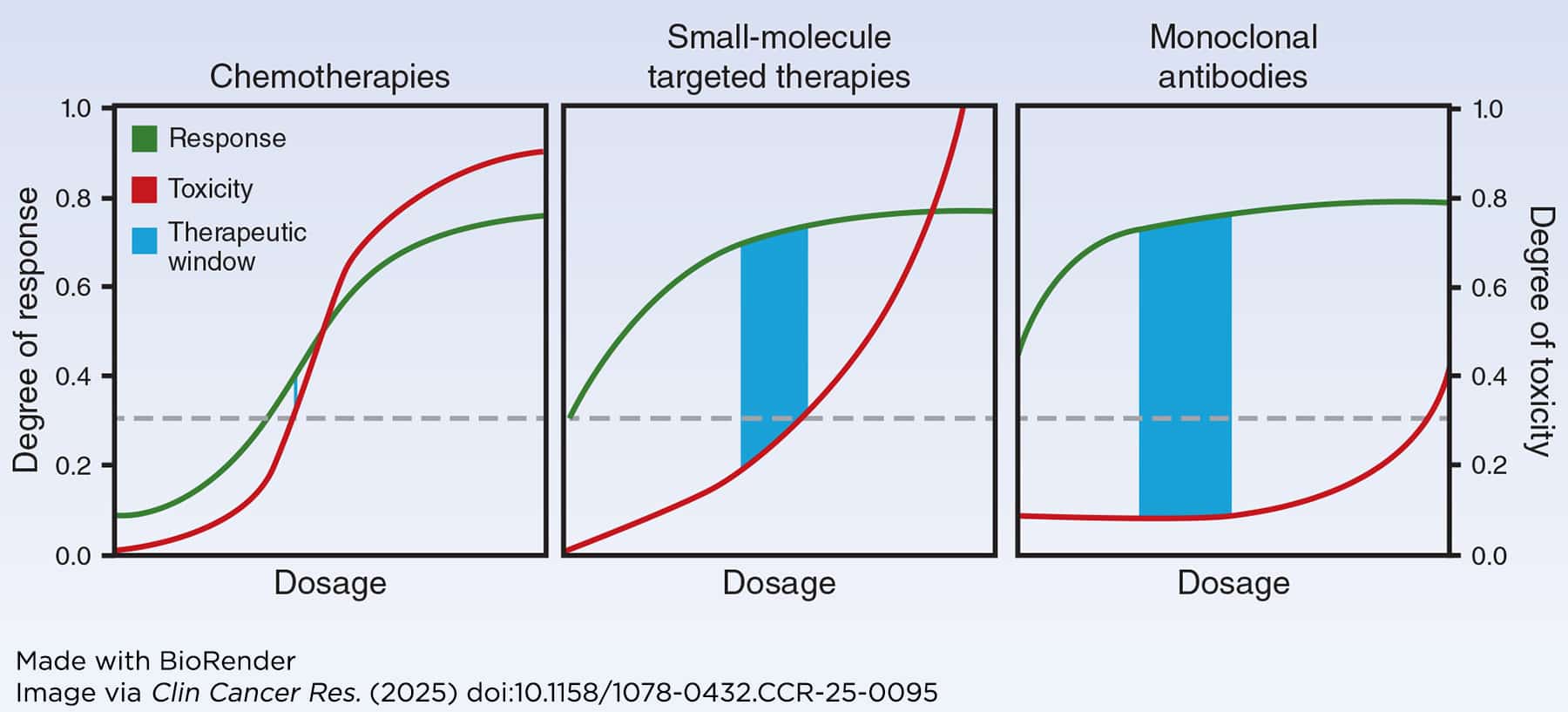Unfortunately, studies have shown that this dose is often poorly optimized. According to one report, nearly 50% of patients enrolled in late-stage trials of small molecule targeted therapies required dose reductions due to intolerable side effects. Further, the U.S. Food and Drug Administration (FDA) has required additional studies to re-evaluate the dosing of over 50% of recently approved cancer drugs. These issues stem from the fact that the 3+3 design doesn’t factor in whether a drug is effective at treating cancer, doesn’t represent the much longer treatment courses patients typically undergo in late-stage trials or clinical care settings with modern drugs, doesn’t correspond with how newer therapeutics work (see figure below), and is even poor at identifying MTD, potentially leading to dosages that are too high and cause unnecessary toxicities. As a result, patient advocates have begun calling for revisions to the traditional MTD-based dosing paradigm.