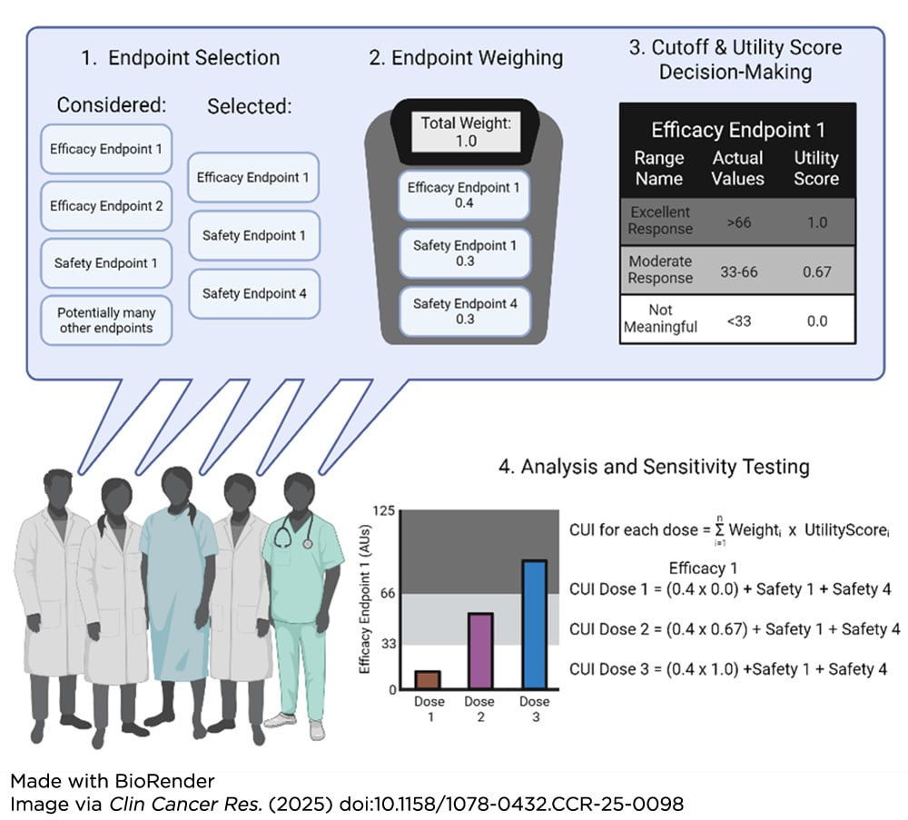 Additionally, backfill and expansion cohorts, which increase the number of patients at certain dose levels of interest within early-stage trials, can provide more clinical information that strengthens the understanding of the benefit/risk ratio of a particular dose level. Once all relevant data have been collected, frameworks such as clinical utility indices (CUI) can provide a quantitative and collaborative mechanism to integrate the data and determine concrete doses of interest (see figure below).