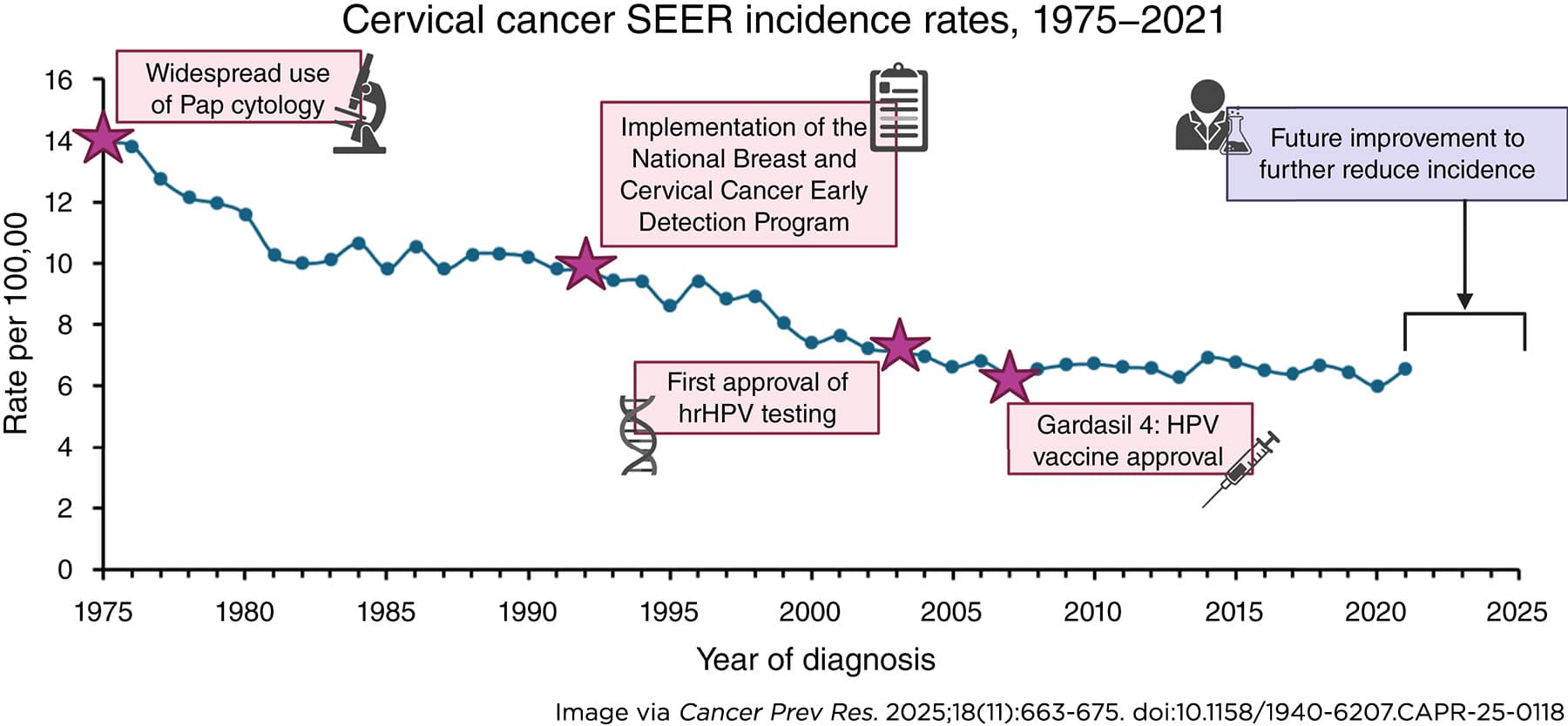 Cervical cancer is one of the few cancers that could be almost entirely prevented, in part thanks to the available screening methods. However, as noted in the Cancer Prevention Research review, incidence rates for cervical cancer have been mostly stable over the past 20 years. This is following a nearly 50% decline between the 1970s, when Pap smears were introduced into the clinical workflow, and around 2005, a few years after the first HPV screening test was approved.