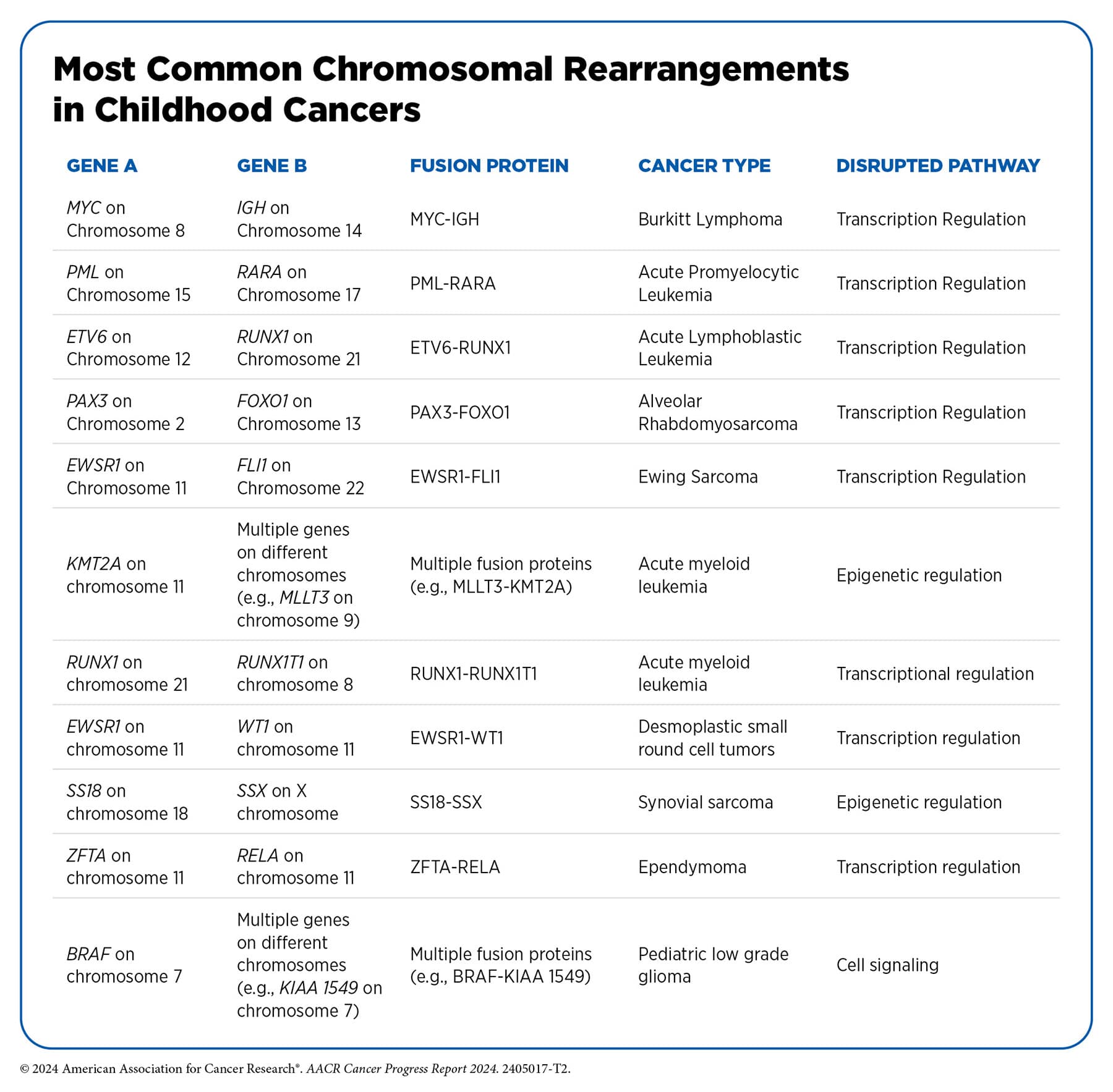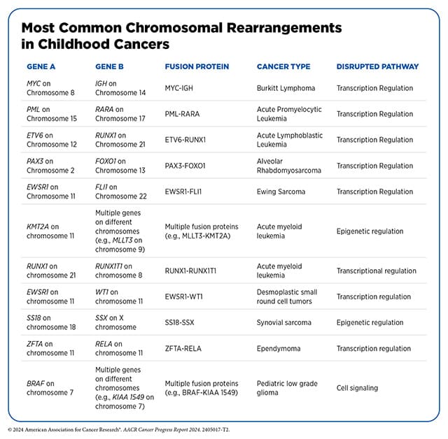 Cancers known to have fusion-positive variants include lung, thyroid, and prostate cancers, as well as certain sarcomas and leukemias. Fusion proteins drive certain childhood cancers as well, as detailed in the 2024 edition of the AACR Cancer Progress Report. Some fusion genes are highly specific to certain cancers, like EWS-FLI1, which is a hallmark of Ewing sarcoma and alters transcription to the cancer’s advantage. Other genes, like NRG1, have been observed fusing with other genes in several combinations across different cancers.