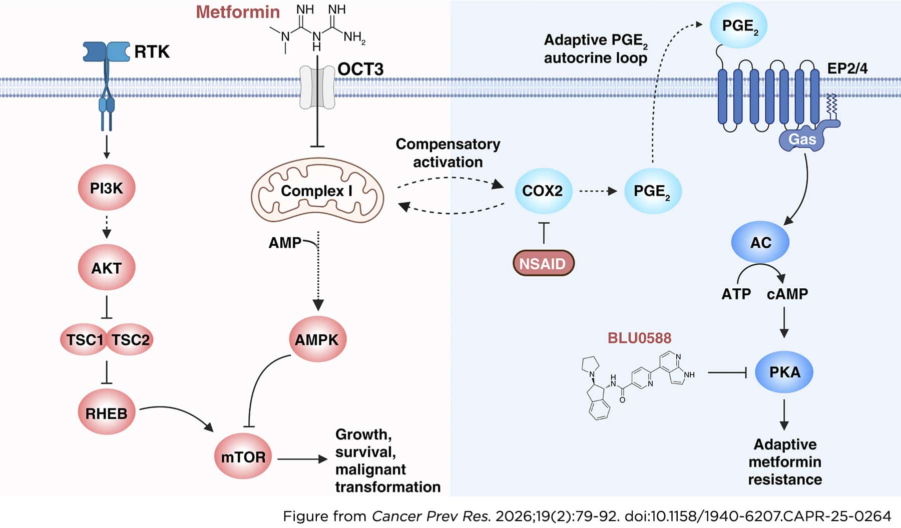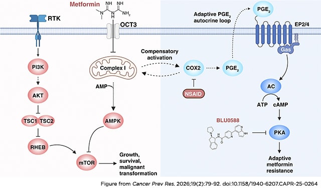 Prevention Relevance: Our findings reveal that using metformin for head and neck cancer chemoprevention leads to compensatory activation of a PKA-driven resistance mechanism that can be blocked by cotreatment with NSAIDs. These findings provide a rationale for combining metformin with NSAIDs as a precision head and neck cancer chemoprevention strategy.