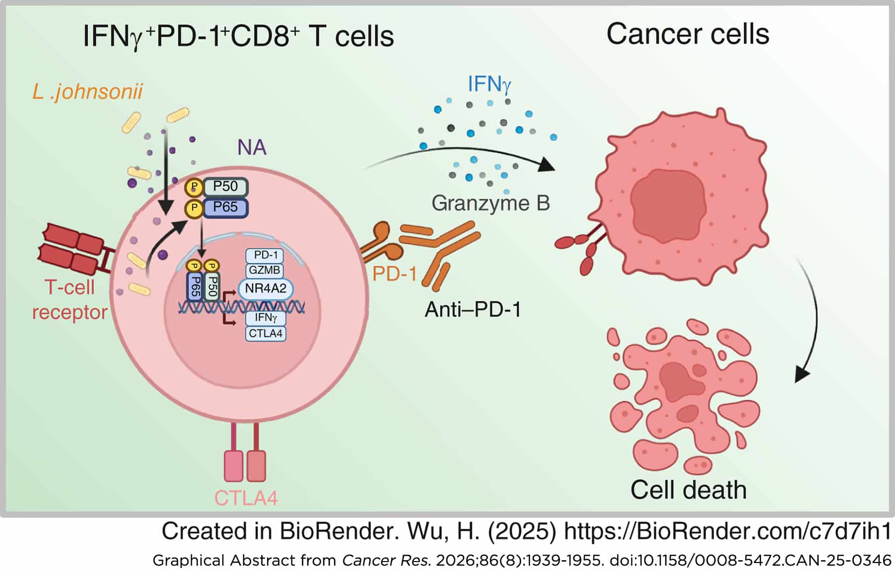 Significance: Lactobacillus johnsonii produces nicotinic acid that expands intratumoral IFNγ+PD-1+CD8+ T cells, which prevents hepatocellular carcinoma relapse and enhances the efficacy of anti-PD-1 therapy.