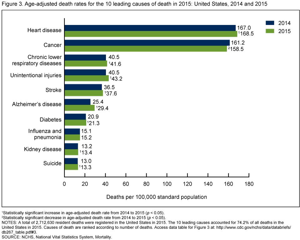 A new government report shows that among the top 10 causes of death in the United States, the death rate for cancer was the only one to decline in 2015.