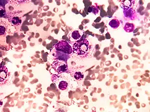 Multiple myeloma develops within the bone marrow when excessive abnormal B cells accumulate and form tumors throughout multiple bones. Smoldering multiple myeloma is an asymptomatic, slow-growing condition that can progress to active multiple myeloma, and one study showed that the cumulative probability of progression after 15 years was 73%. The National Cancer Institute estimated that, in the United States, 36,110 individuals would be diagnosed with multiple myeloma and 12,030 patients would die of the disease in 2025. A recent measure of smoldering multiple myeloma incidence in Canada showed 1.4 cases per 100,000 people.