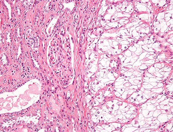 Renal cell carcinoma is a kidney cancer that originates in the lining of the proximal convoluted tubule, a part of the very small tubes in the kidney. It usually occurs in people between the ages of 60 and 70 and tends to be more common in males.