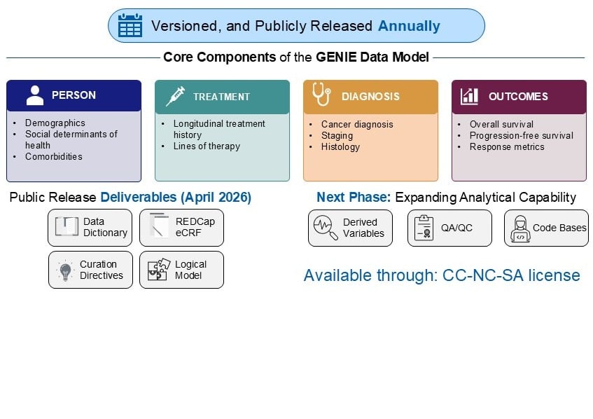 AACR Project GENIE Data Model (GDM), developed by the AACR Project GENIE consortium, is an open-source, pan-cancer framework that standardizes longitudinal clinico-genomic data from diagnosis through long-term outcomes. The complete model specifications, value sets, and supporting documentation are publicly available on GitHub (CC-NC-SA license). Data elements can be mapped to established terminologies (SNOMED CT, LOINC, ICD-O, NCIt) and aligned with HL7 FHIR and OMOP CDM structures. A dual-pathway architecture supports both manual abstraction and programmatic collection, preserving data provenance while positioning the model for emerging NLP and automation capabilities.