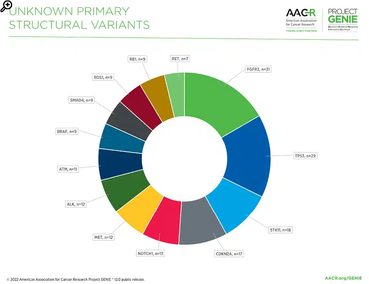 Figure 2: The most common gene fusions/structural variants in cancer of unknown primary in the AACR Project GENIE® Registry in release 12.0-public.