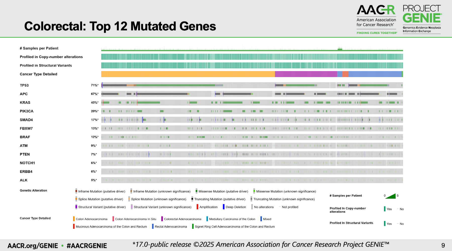 The 17.0 public release provides a detailed look at the genomic landscape of colorectal cancer, offering valuable insights. The registry includes 19,544 patients and 20,599 samples, helping to deepen our understanding of this cancer. TP53, APC, KRAS and PIK3CA are the most frequently mutated genes among other key mutations.