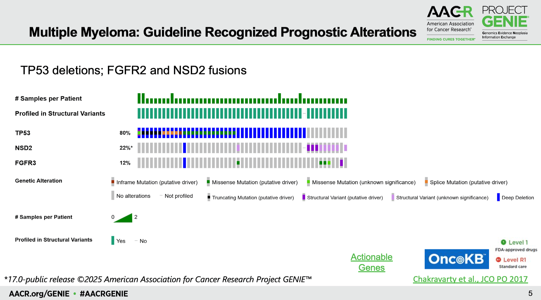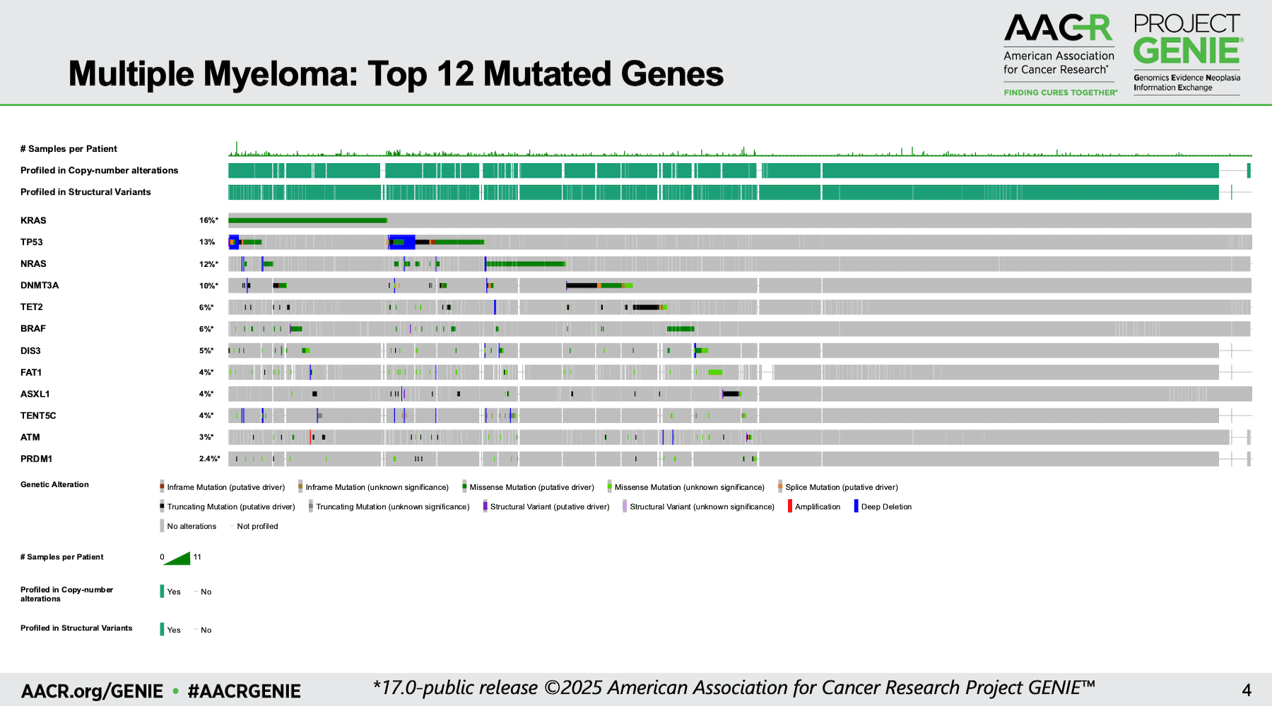 The 17.0 public release provides a detailed look at the genomic landscape of Multiple Myeloma, offering valuable insights. The registry includes 1,167 patients and 1,548 samples, helping to deepen our understanding of this cancer. KRAS, TP53, NRAS, and DNMT3A are the most frequently mutated genes among other key mutations. The data below highlight several guideline recognized alterations, including the TP53 deletions as well as FGFR3 and NSD2 fusions.