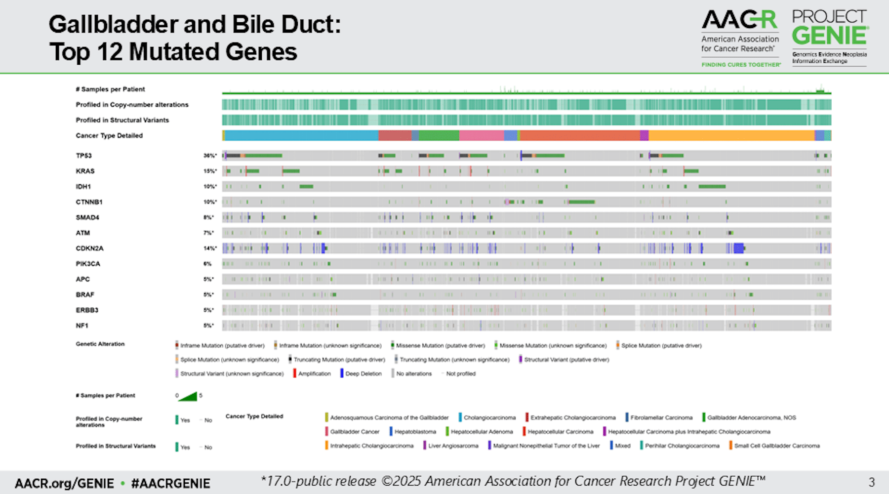 February is gallbladder and bile duct cancer awareness month. As highlighted in a recent blogpost, new advances are being made in the treatment of these rare diseases. The 17.0 public release provides a detailed look at the genomic landscape of gallbladder and bile duct cancers, offering valuable insights. The registry includes 4,416 patients and 4,625 samples, helping to deepen our understanding of these rare cancers. TP53, KRAS, IDH1, CTNNB1, and SMAD4 are the most frequently mutated genes among other key mutations.