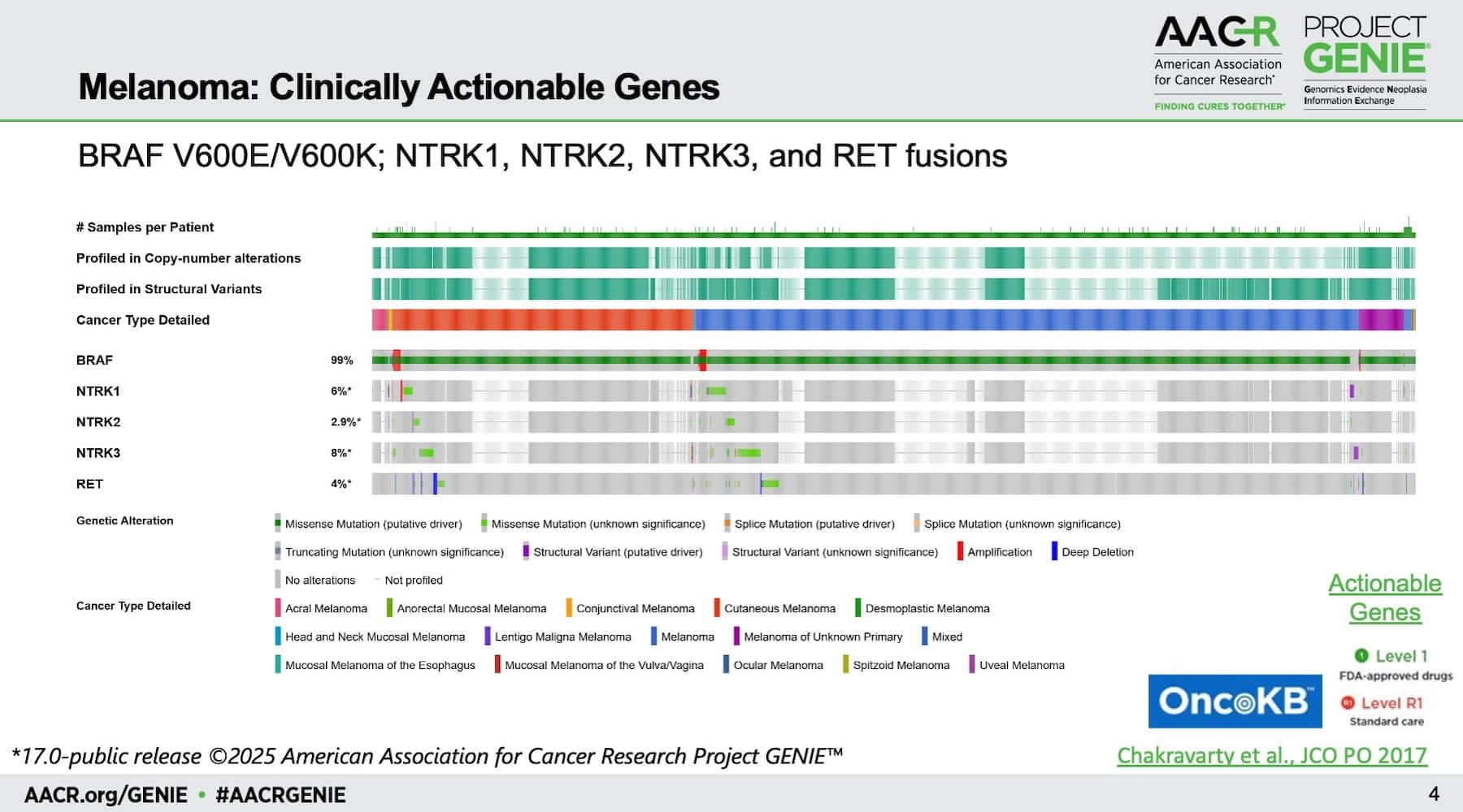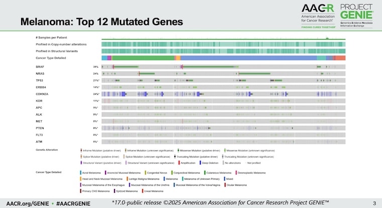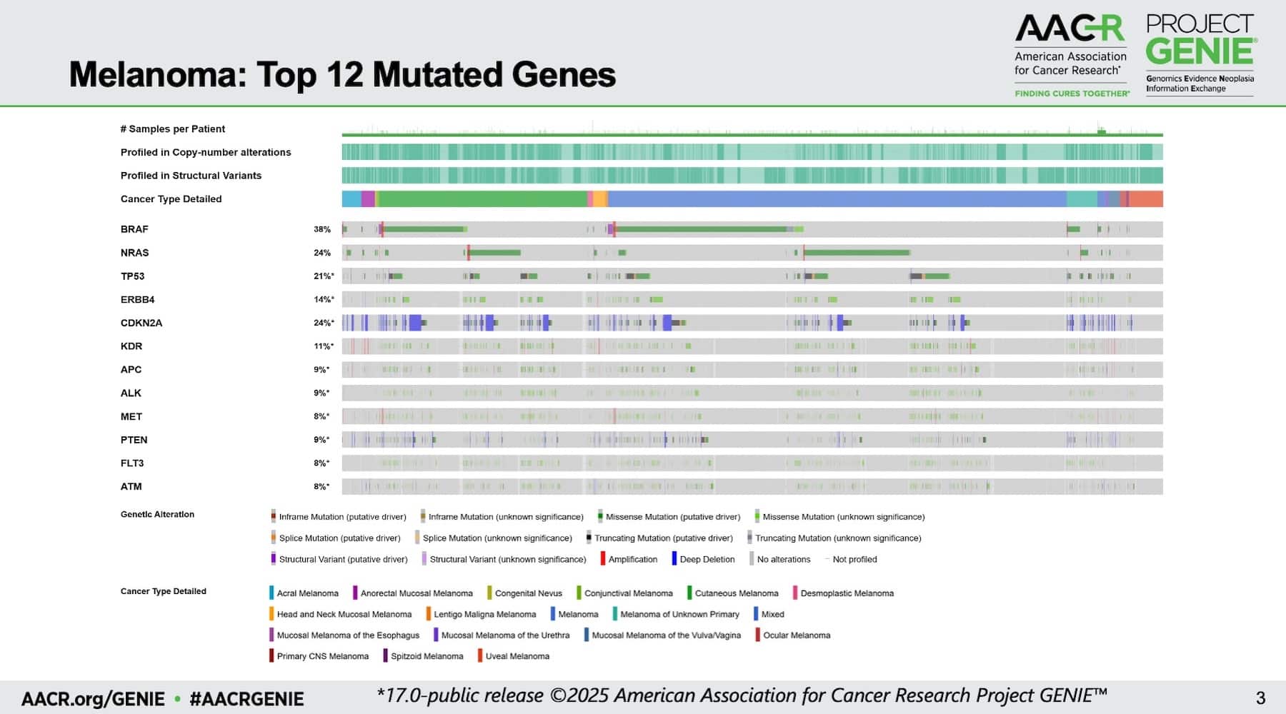 The 17.0 public release provides a detailed look at the genomic landscape of Melanoma, offering valuable insights. The registry includes 8,452 patients and 8,960 samples, helping to deepen our understanding of this cancer. BRAF, NRAS, TP53 and ERBB4 are the most frequently mutated genes among other key mutations. These data highlight several guideline recognized alterations, including BRAF V600E/V600K, NTRK1, NTRK2, NTRK3, and RET fusions.