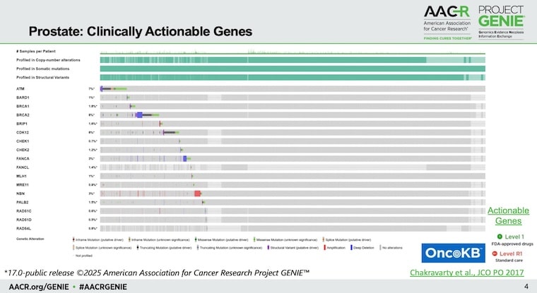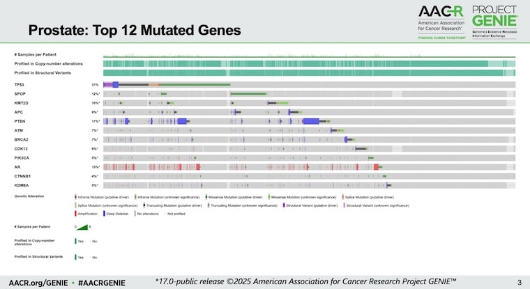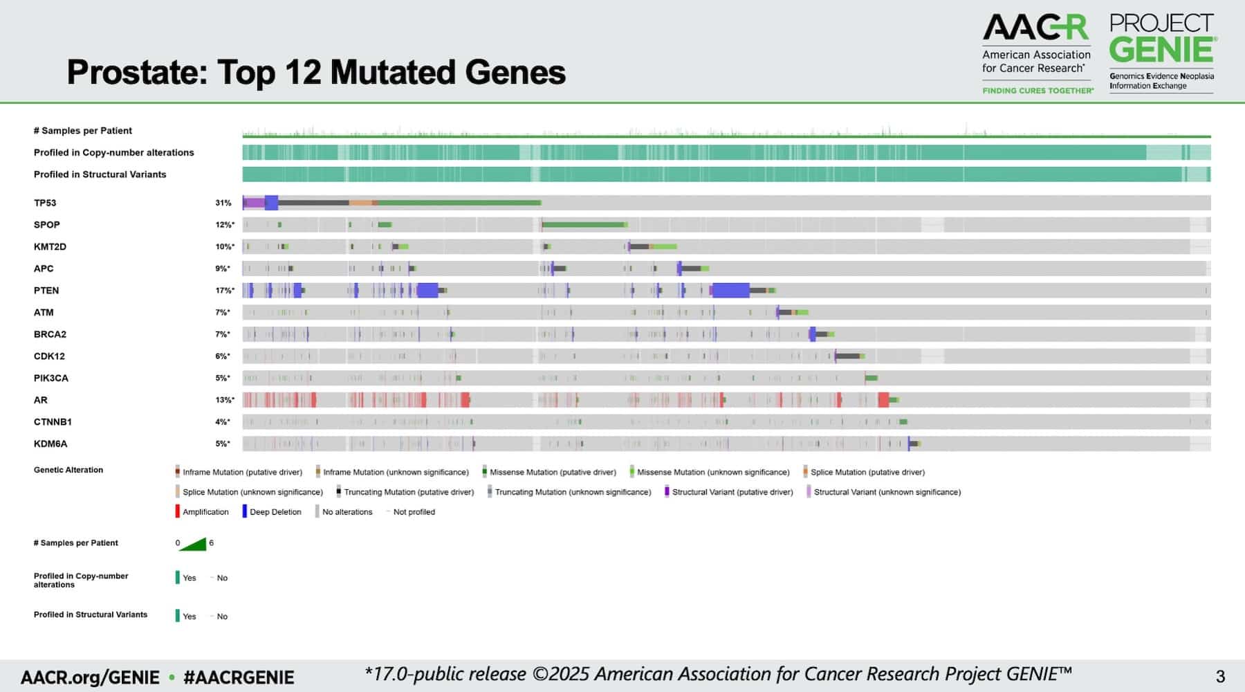 June is Men’s Health Awareness Month, a time to highlight conditions that impact men’s well-being. One of the most common is prostate cancer, with more than 300,000 new cases diagnosed each year in the United States. The 17.0 public release provides a detailed look at the genomic landscape of prostate cancer, offering valuable insights. The registry includes 6,952 prostate cancer patients and 7,649 samples, helping to deepen our understanding of this cancer. TP53, SPOP, KMT2D and APC are the most frequently mutated genes among other key mutations. These data highlight several clinically actionable alterations, including ATM, BRCA2, CDK12, FANCA, and NBN.