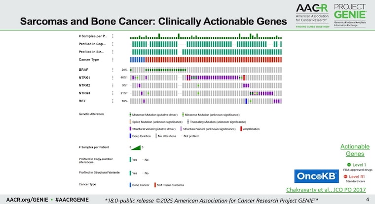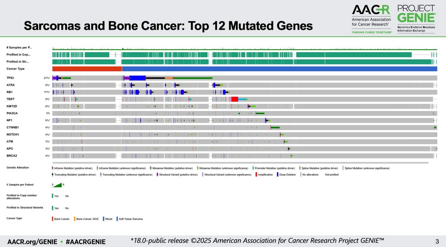 July is Sarcoma and Bone Cancer Awareness Month, a time to spotlight rare but serious cancers that affect bones and soft tissues. Sarcomas account for a small percentage of adult cancers but are often aggressive and challenging to treat. The 18.0 public release offers a detailed view of the genomic landscape of sarcomas and bone cancers, providing critical insights for researchers and clinicians. The registry includes 7,903 sarcoma and bone cancer patients with 8,703 NGS samples, helping to deepen our understanding of this cancer. TP53, ATRX, RB1, and TERT area among the most frequently mutated genes. These data also highlight several clinically actionable alterations, including the BRAF V600E mutation and fusions in NTRK1, NTRK2, NTRK3, and RET.