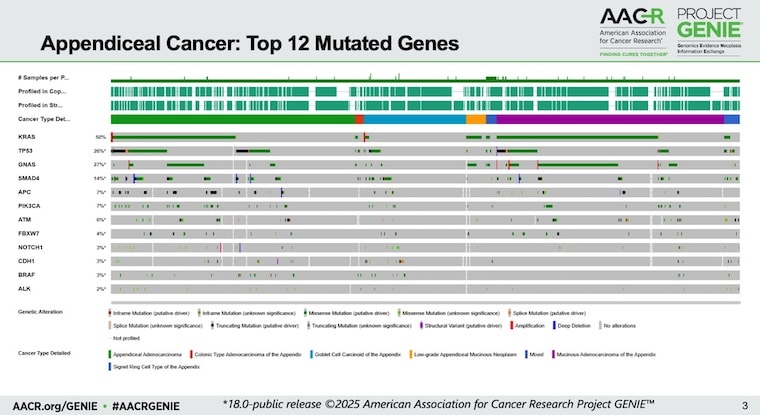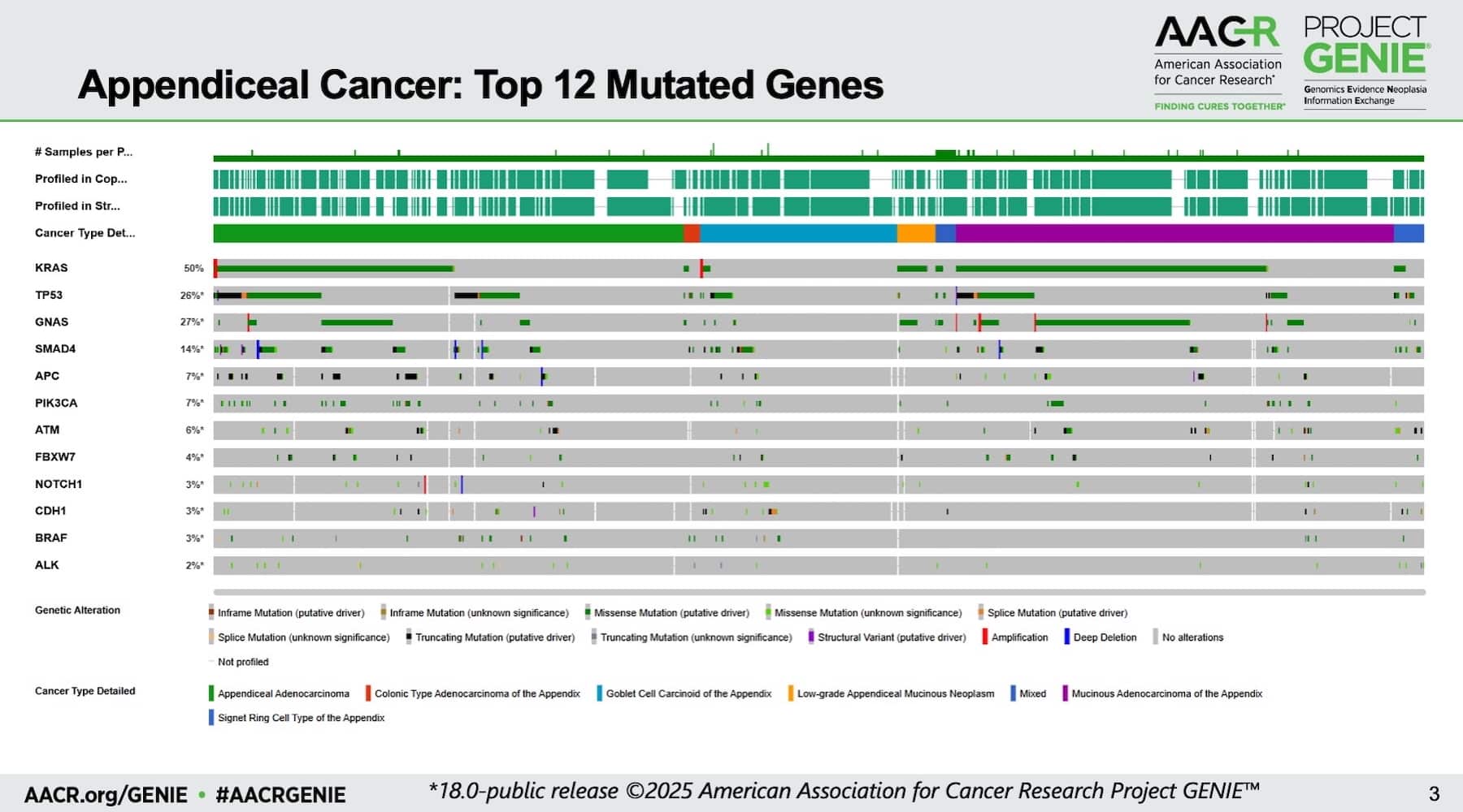 August is Appendiceal Cancer Awareness Month, a time to raise awareness about this rare malignancy that originates in the appendix. Though uncommon, appendiceal cancers are rising sharply among younger generations, especially for those born in the 1970s and 1980s, with incidence rates tripling or even quadrupling compared to earlier birth cohorts. The 18.0 public release offers a detailed view of the genomic landscape of appendiceal cancers, offering valuable insights for researchers and clinicians. The registry includes 967 appendiceal cancer patients with 1,015 NGS samples, helping to deepen our understanding of this cancer. Among the most frequently mutated genes are KRAS, TP53, GNAS, and SMAD4.