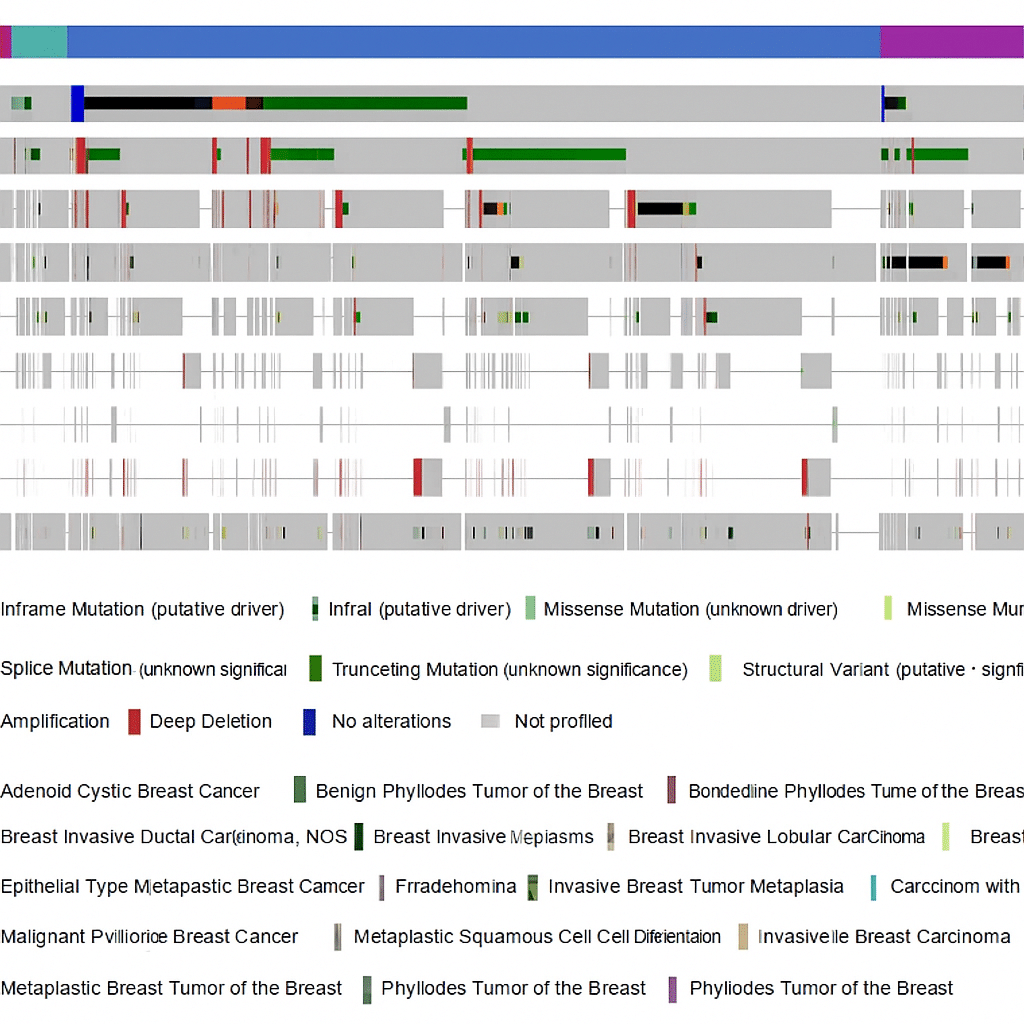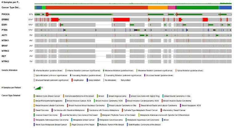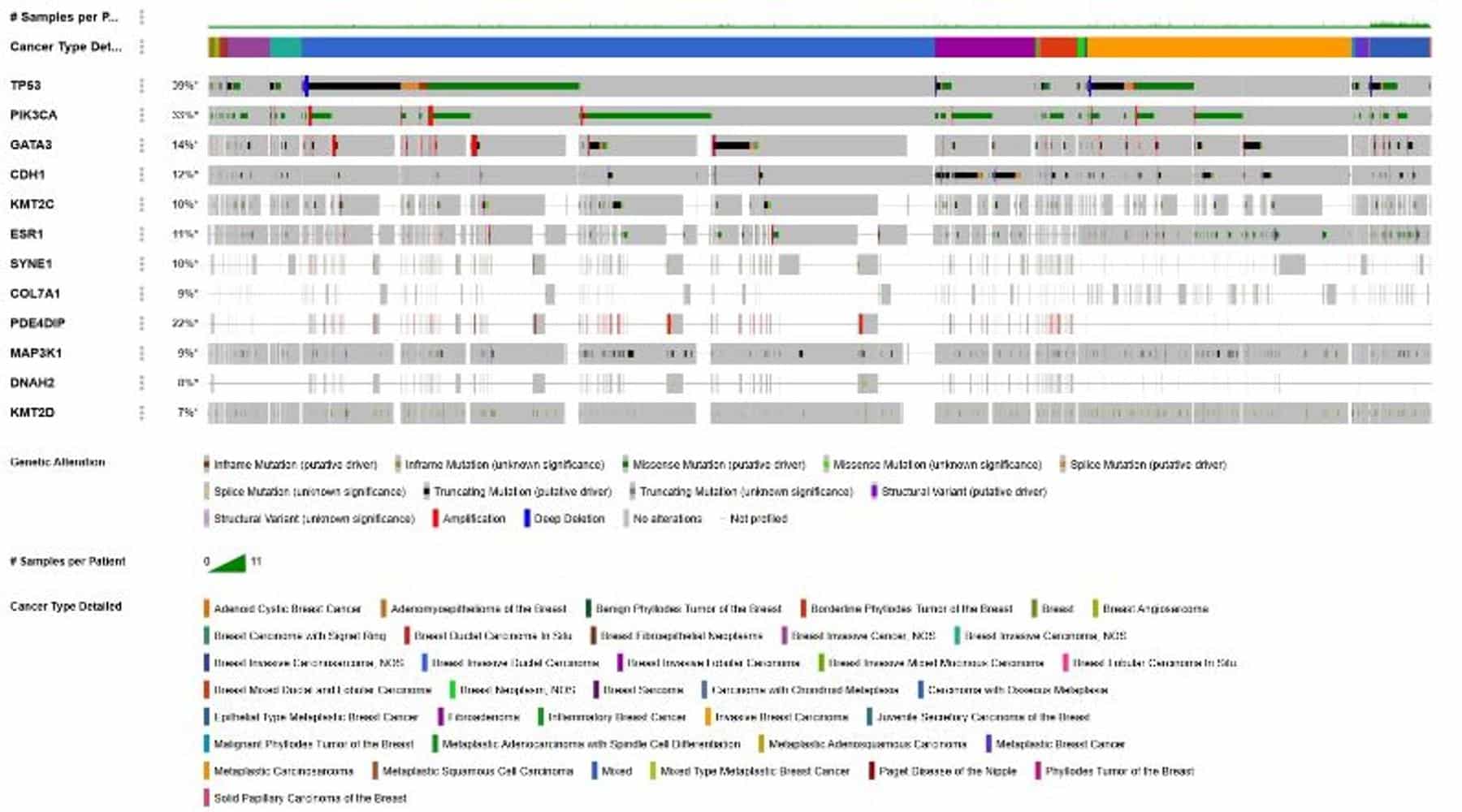The AACR Project GENIE 18.0-public release provides a detailed look at the genomic landscape of breast cancer, offering valuable insights. The registry includes 18,463 breast cancer patients and 21,002 samples, including 204 samples from male patients, helping to deepen our understanding of this cancer. TP53, PIK3CA, GATA3 and CDH1 are the most frequently mutated genes among other key mutations. These data highlight several clinically actionable alterations, including AKT1:E17K, BRAF:V600E, ERBB2 amplifications, NTRK and RET fusions, as well as PIK3CA, ESR1, and PTEN mutations.