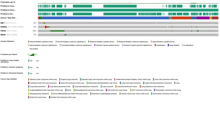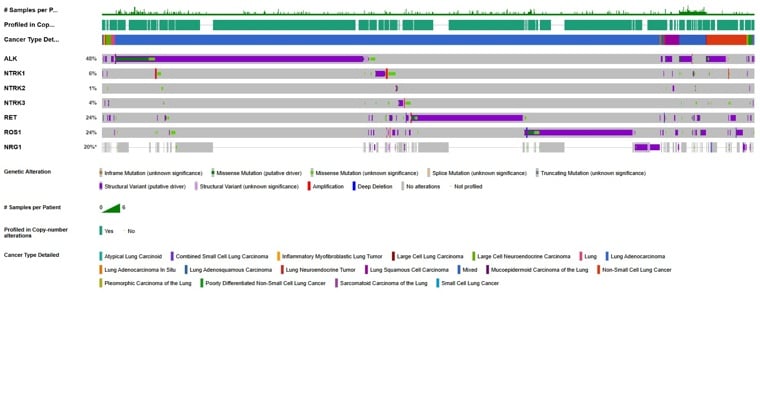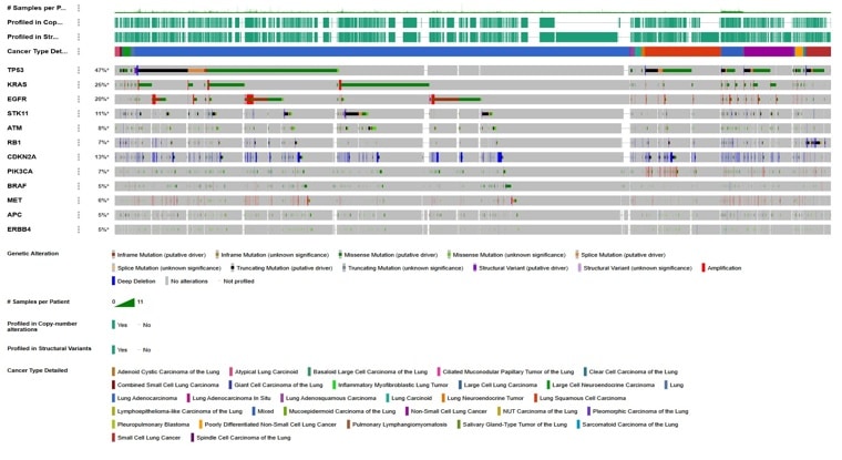 The AACR Project GENIE 18.0-public release includes genomic data from 31,812 patients and 37,763 lung cancer samples, offering researchers a high-resolution view of the evolving molecular landscape. TP53, KRAS, EGFR, and STK11 are the most frequently mutated genes among other key mutations. These data also reveal actionable alterations such as EGFR, ALK, ROS1, RET, and BRAF V600E, supporting a range of approved targeted therapies.