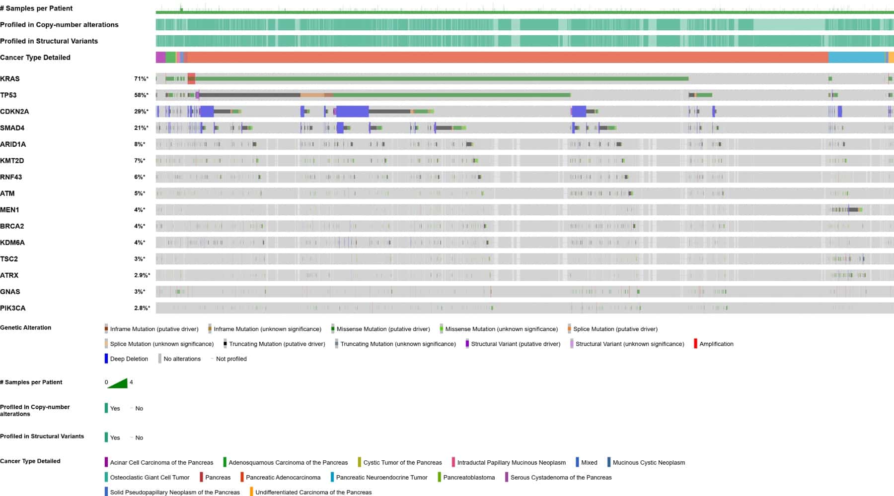 The AACR Project GENIE 18.0 public release includes genomic data from 10,227 patients and 10,684 pancreatic cancer samples, offering researchers an in-depth resource to explore key molecular drivers. KRAS, TP53, CDKN2A, and SMAD4 are the most frequently mutated genes among other key mutations. These data also highlight guideline-recognized alterations, including BRAF V600E and NTRK1/2/3 and RET fusions linked to approved targeted therapies.