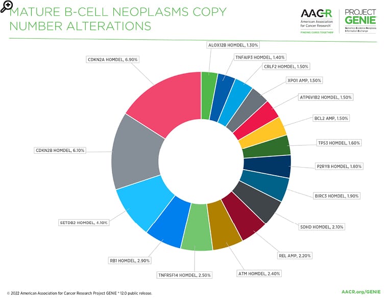 Figure 3: The most common copy number alterations in Mature B-Cell Neoplasms in the AACR Project GENIE® Registry in release 12.0-public