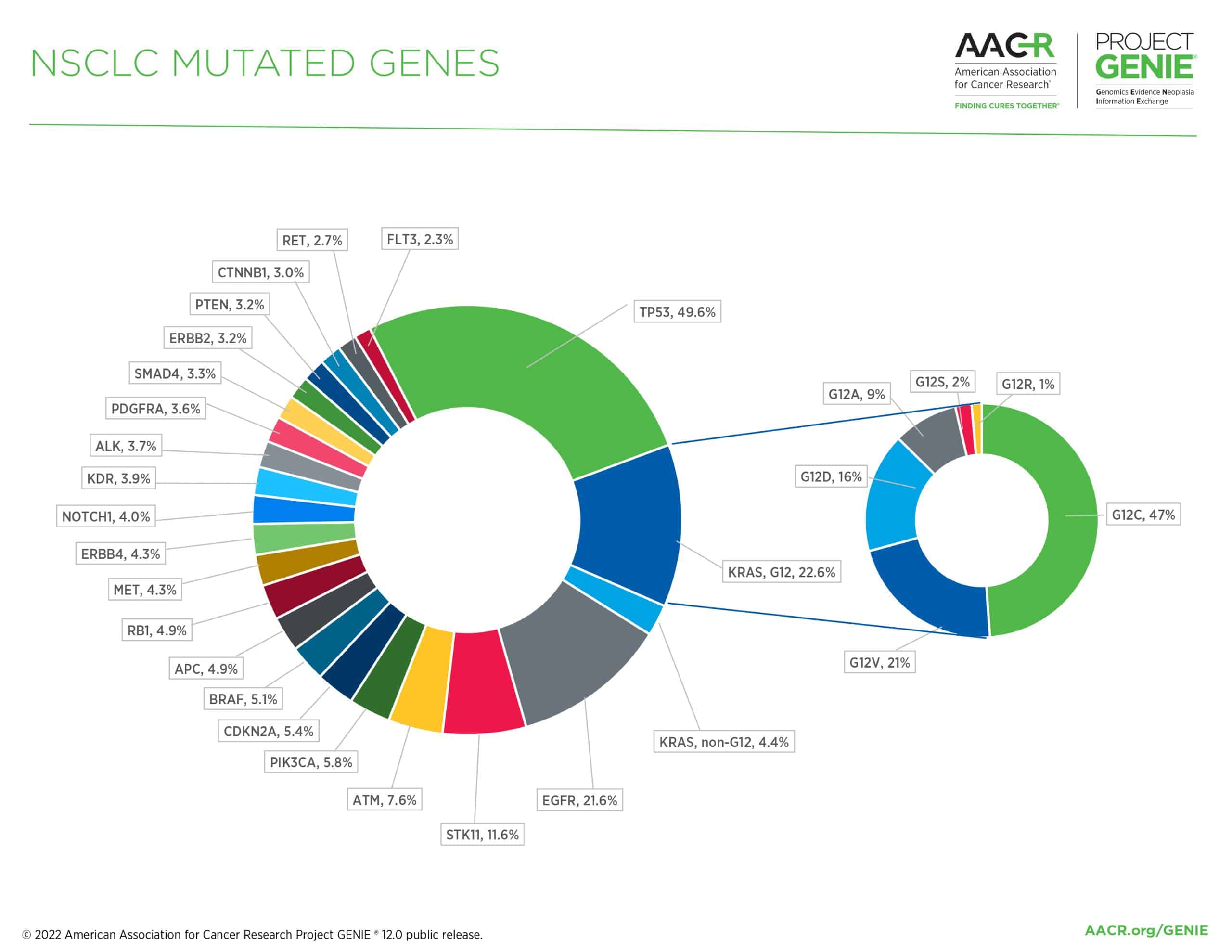 Figure 1: The most commonly mutated genes in non-small cell lung cancer (NSCLC) in the AACR Project GENIE® registry in release 12.0-public. Inset displays the distribution of KRAS G12 variants in non-small cell lung cancer in the AACR Project GENIE registry.