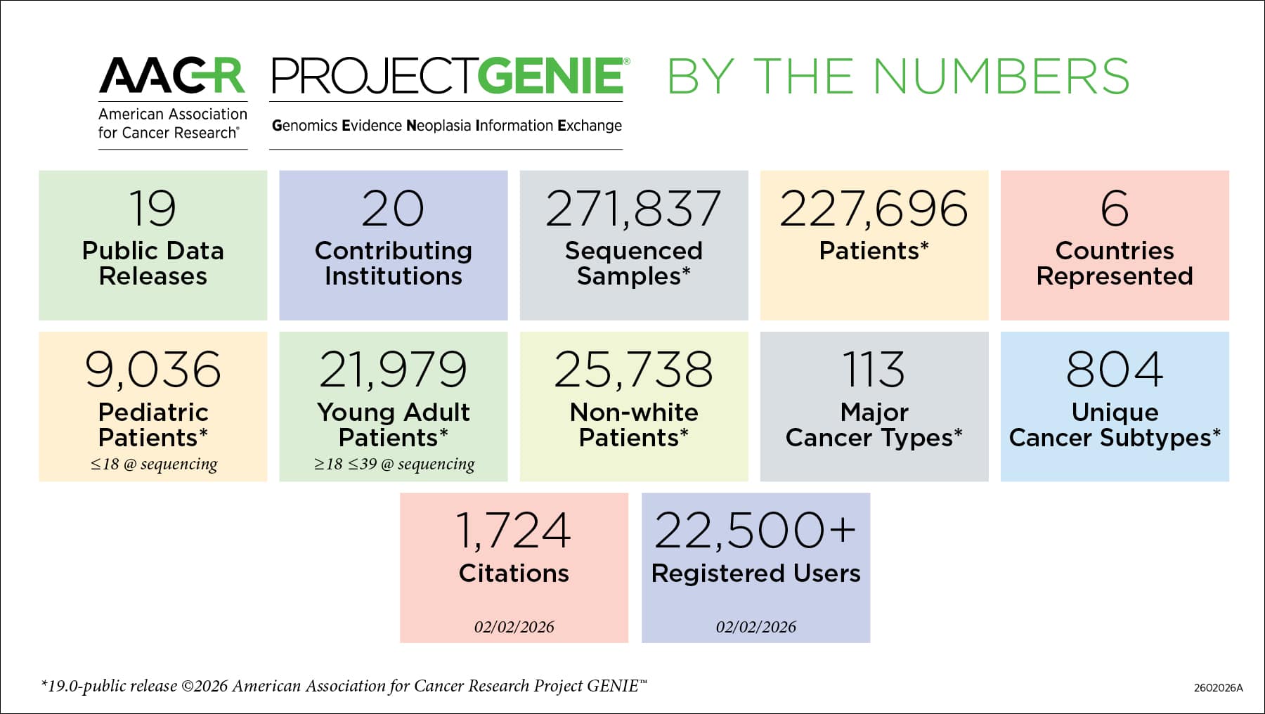 AACR Project GENIE v19.0-public is now available (271,837 samples / 227,696 patients) with newly added cfDNA samples.